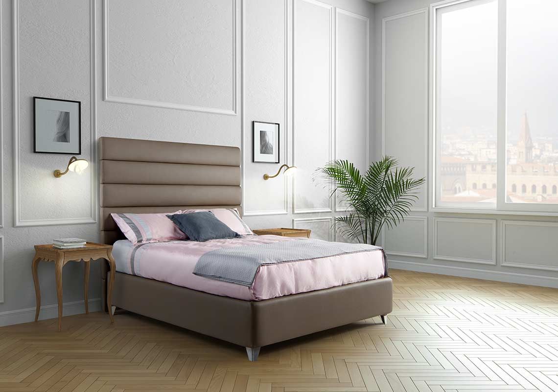 The Arezzo bed, with its strong personality, is characterized by a very tall headboard, the design of which reminds one of a modern boiserie.