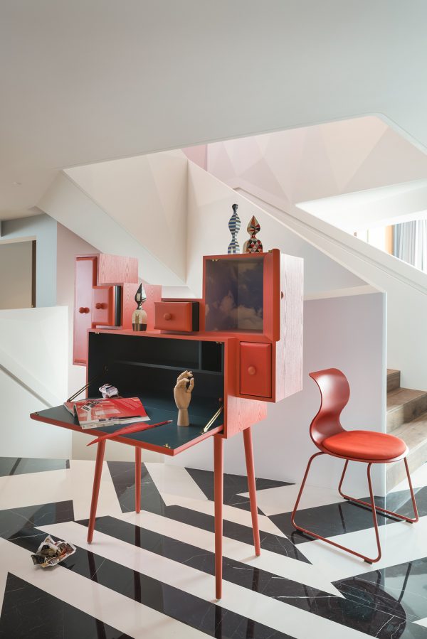 Confidence of a cloud寫字桌的外形由柜子與盒子堆疊而成。設計師通過作品向過去在古董寫字桌上親筆寫信的年代致敬。Confidence of a cloud在兼具功能的同時,充滿神秘感。藏于某只柜子內部的桌面和桌肚維持著隱私。而打開另一只柜子,一片飄著云朵的天空藏于其中,供使用者短暫地逃離現實,暢游夢想。