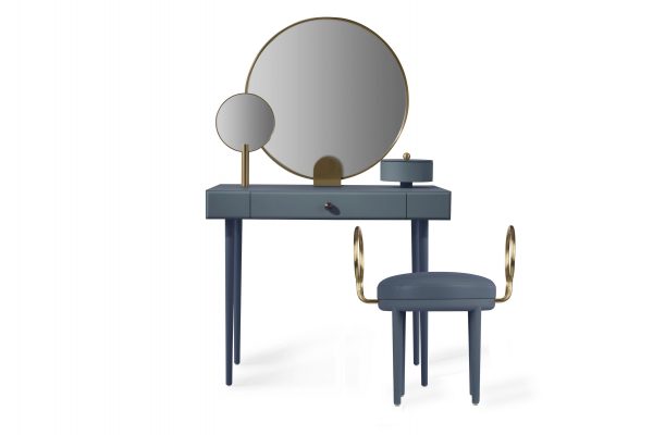 Rose Sélavy得名自法國藝術家、達達主義核心成員馬塞爾?杜尚筆下的一個虛構角色。Rose Sélavy線條清秀,水彩色和玫瑰金配件構成了優雅的配色,無處不在歌頌女性之美。梳妝臺臺面上有一個精巧的盒子供擺放珠寶首飾。梳妝臺有一面中央圓鏡,另配有一面小圓鏡置于一邊,可以隨時取下作為手持鏡使用。