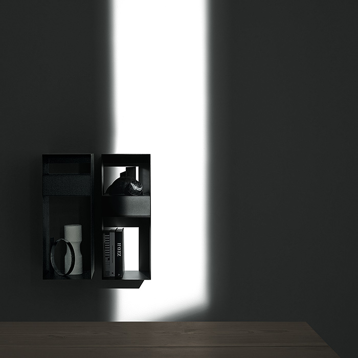 Three basic modules to draw a wall by alternating solids and voids. A highly customisable system of open cabinets that can be equipped with shelves and drawers, C.O.P. is designed to be efficient thanks to smart technical solutions, without sacrificing the pleasure of geometric decoration.