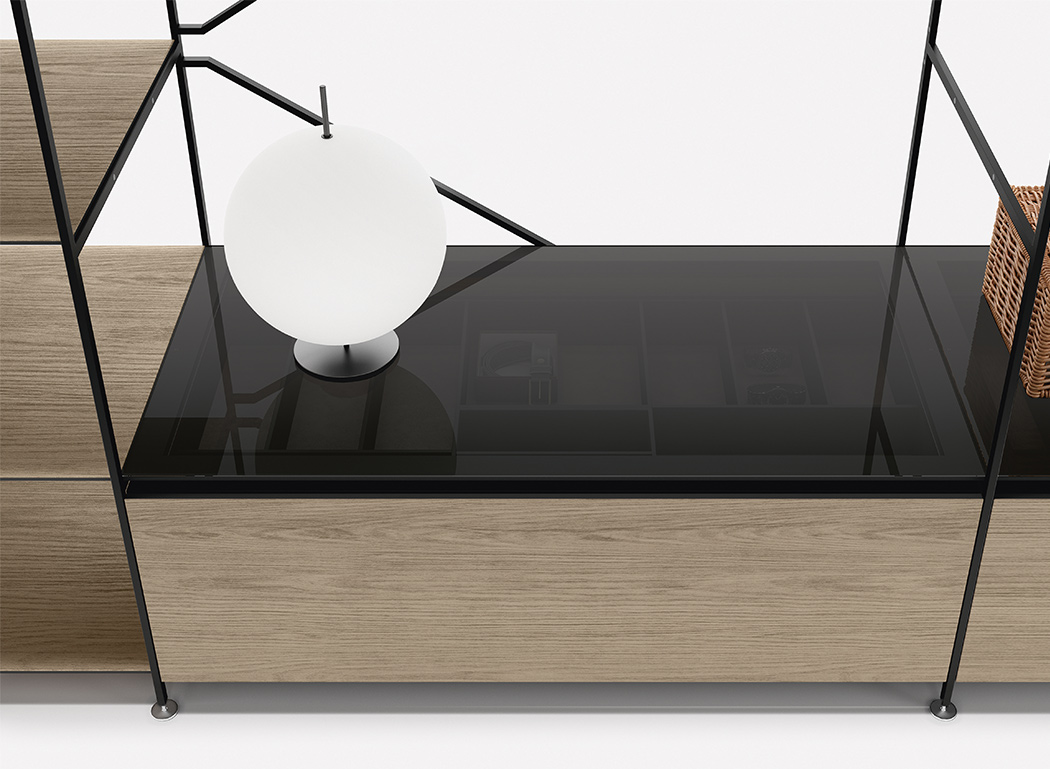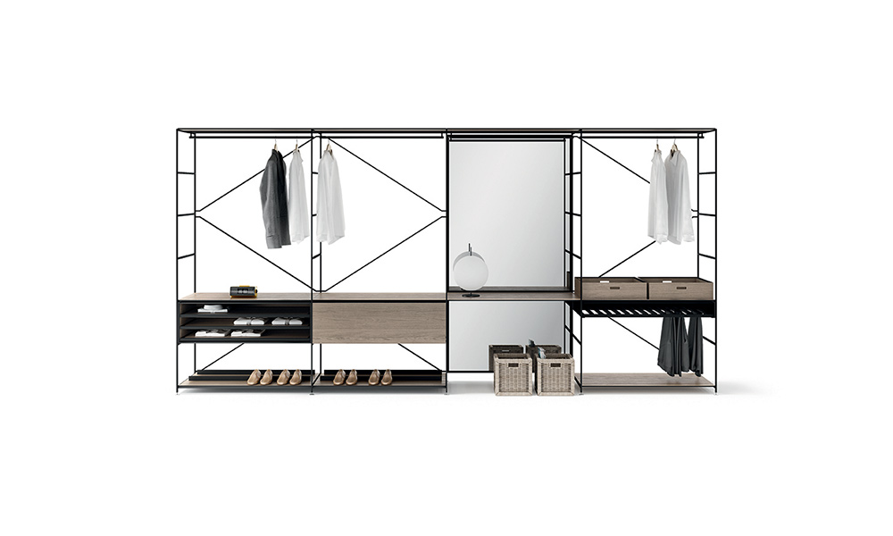 The R.I.G. modular system originally designed for the home now extends its use as wardrobe thanks to its versatility and specific accessories. The module has been specially designed for the sleeping areas and allows different compositions, perfect in every detail. It is enriched with specific accessories for shirts, trousers and shoes, together with hangers and traditional shelves with large-capacity drawer units and background mirrors that create vanity unit for the bathroom.