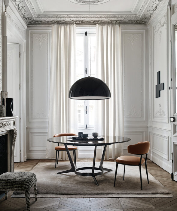 Caratos is a series of upholstered seats united by a recognisable frame in die-cast aluminium. One version characterised by an enveloping upholstered back that also forms the armrest, Caratos is a chair that is free from postural constraints, favouring conversation and interaction with those nearby. Another version, available only in leather, stands out for its basic, geometric frame with highly calibrated thicknesses and details. This is a decidedly light product, not just in terms of its essential, linear design, but also due to its reduced weight ensuring easy handling. The seat and backrest are formed by plastic structural panels on which rests a layer of polyurethane which is then covered in premium leather. They are also part of the collection hte stools with a swivel seat, capable of adapting to heterogeneous furnishing settings through contemporary lines reminiscent, however, of certain twentieth century furniture styles.