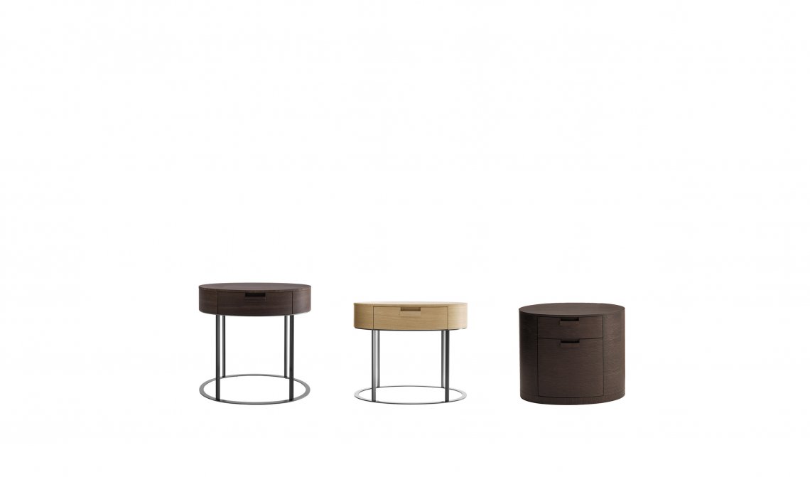 Perfect to be placed next to the bed, Amphora is presented in two versions: one has compact oval shape and holds two drawers of different sizes, the second one has a refined metal structure and hold one single drawer.