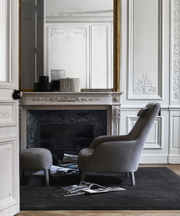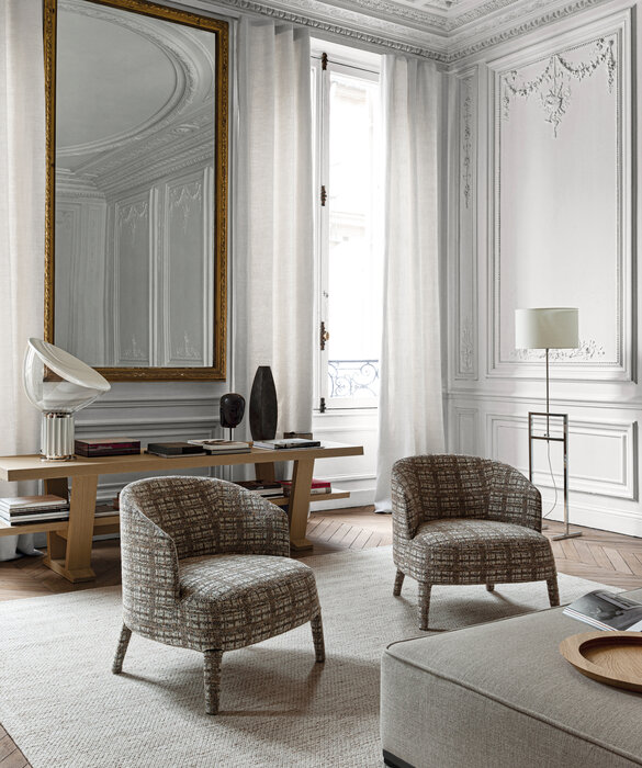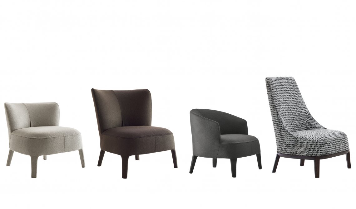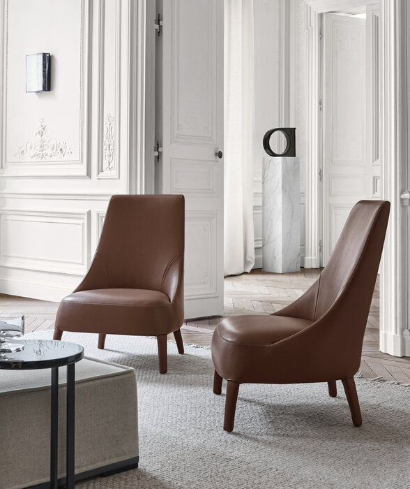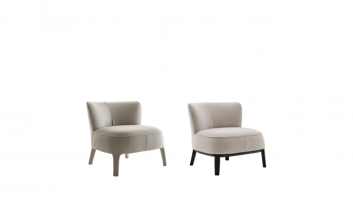 The Febo armchairs are a traditional type of seat. Sharing the same soft, elegant lines, they come in different versions, with a more or less enveloping shape, with a high or low backrest, and with or without armrests. The fabric or leather upholstery is embellished by visible blanket stitching and, in a sophisticated single-material version, also incorporates the feet. The base frame also comes in solid wood in different finishes. The Febo series includes sofas, chaise longues, chairs, beds and ottomans.