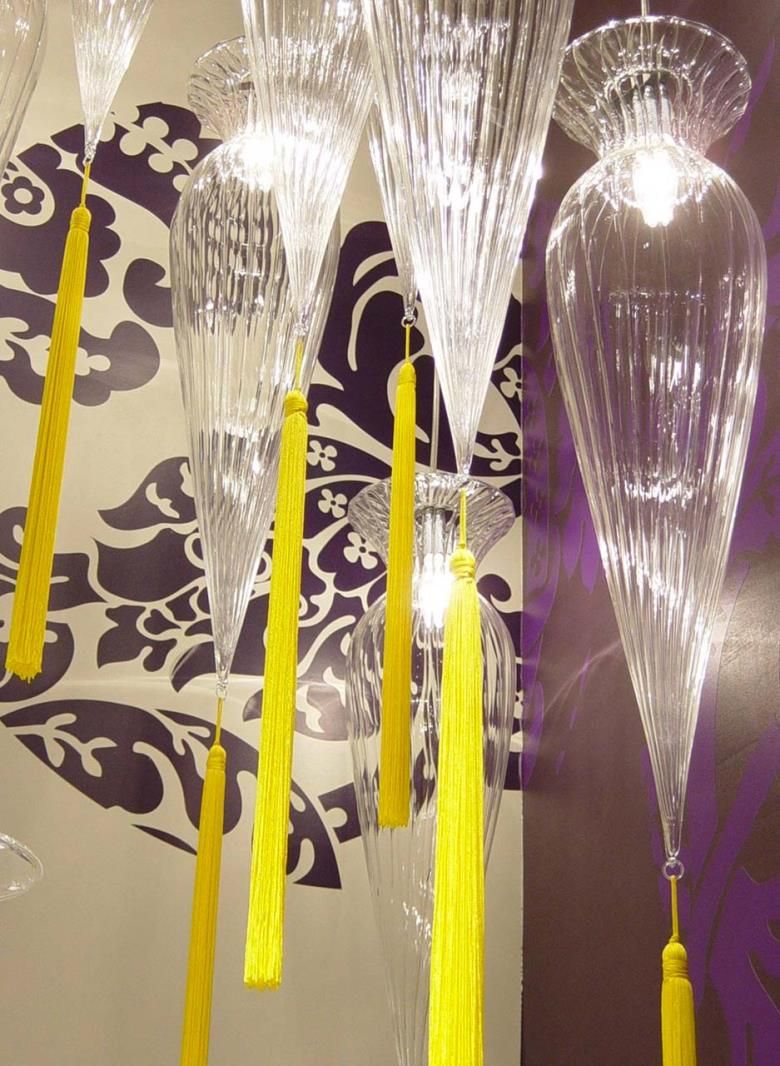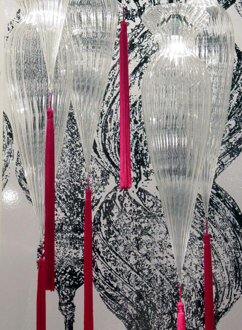 Suspension lamp. Hand blown titanium metallized glass dome with internal frosted bubble glass sculpture.