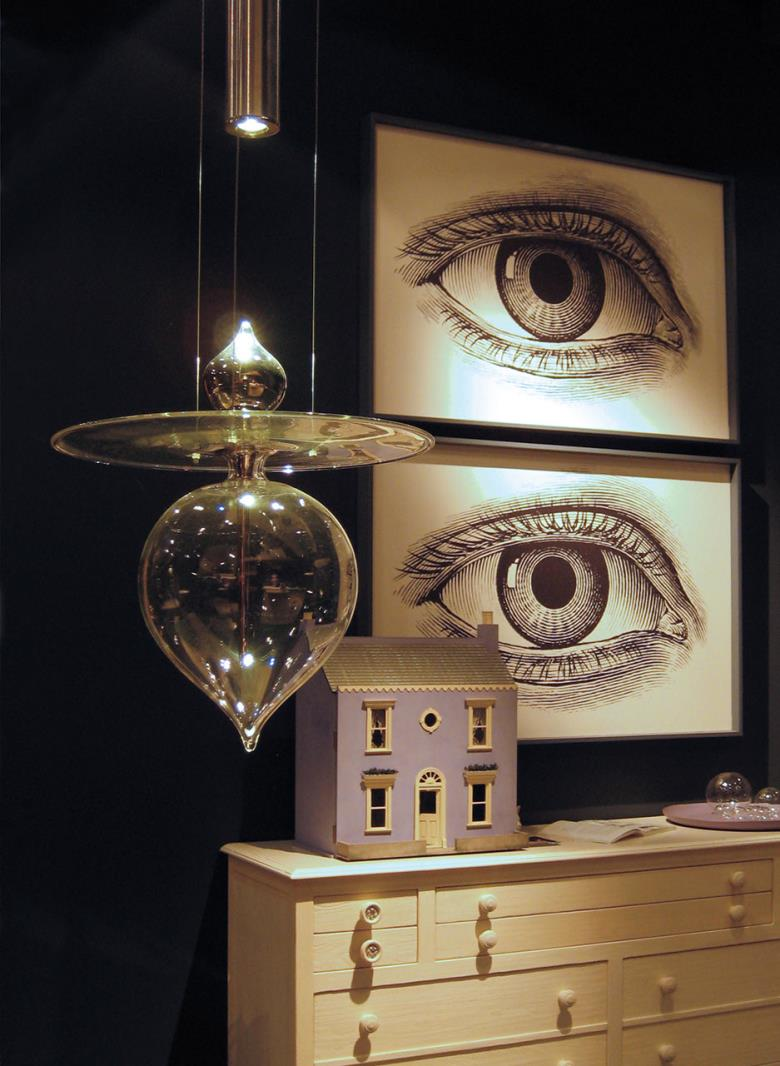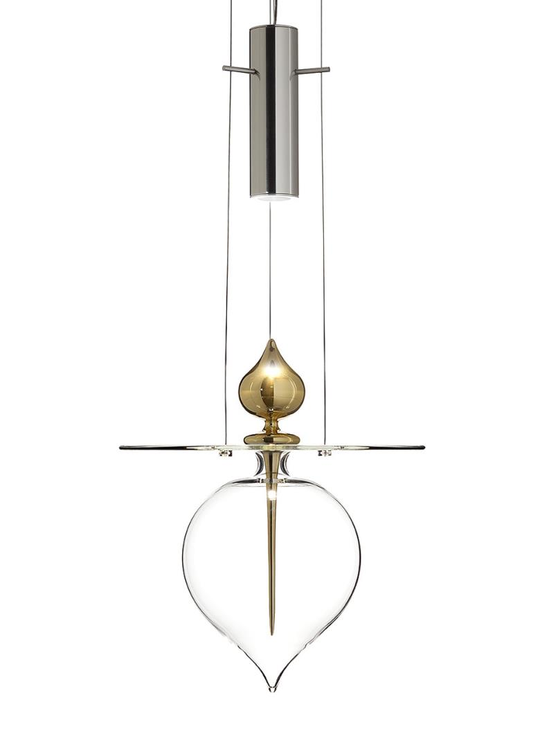 Suspension lamp. Hand blown titanium metallized glass dome with internal frosted bubble glass sculpture.