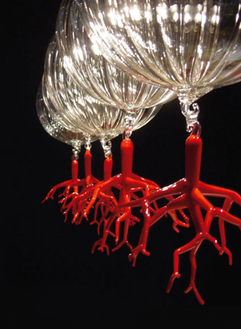 Suspension lamp. Hand blown titanium metallized glass dome with internal frosted bubble glass sculpture.