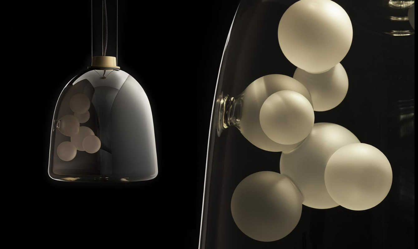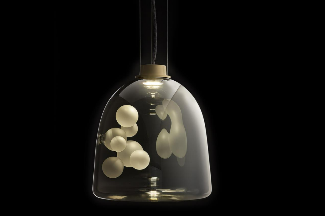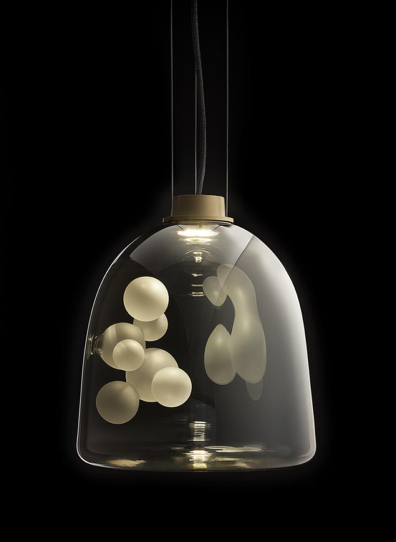 Suspension lamp. Hand blown titanium metallized glass dome with internal frosted bubble glass sculpture.