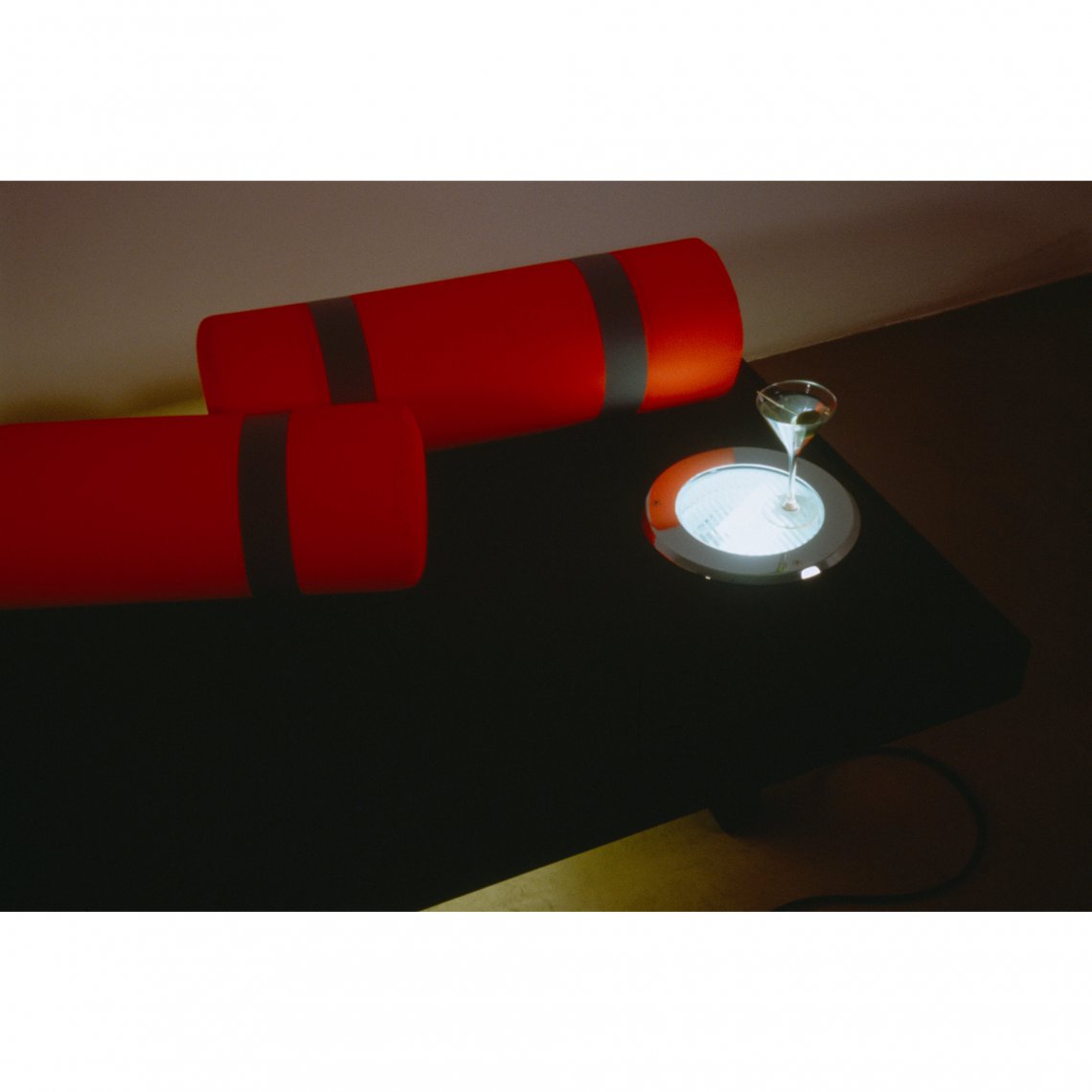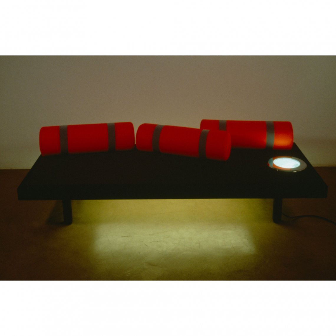Bench in liquid rubber painted wood, polyester upholstery and cylindric cushions in fluorescent fabric with reflective silver ribbons, recessed fluorescent spotlight and white fluorescent light underneath.