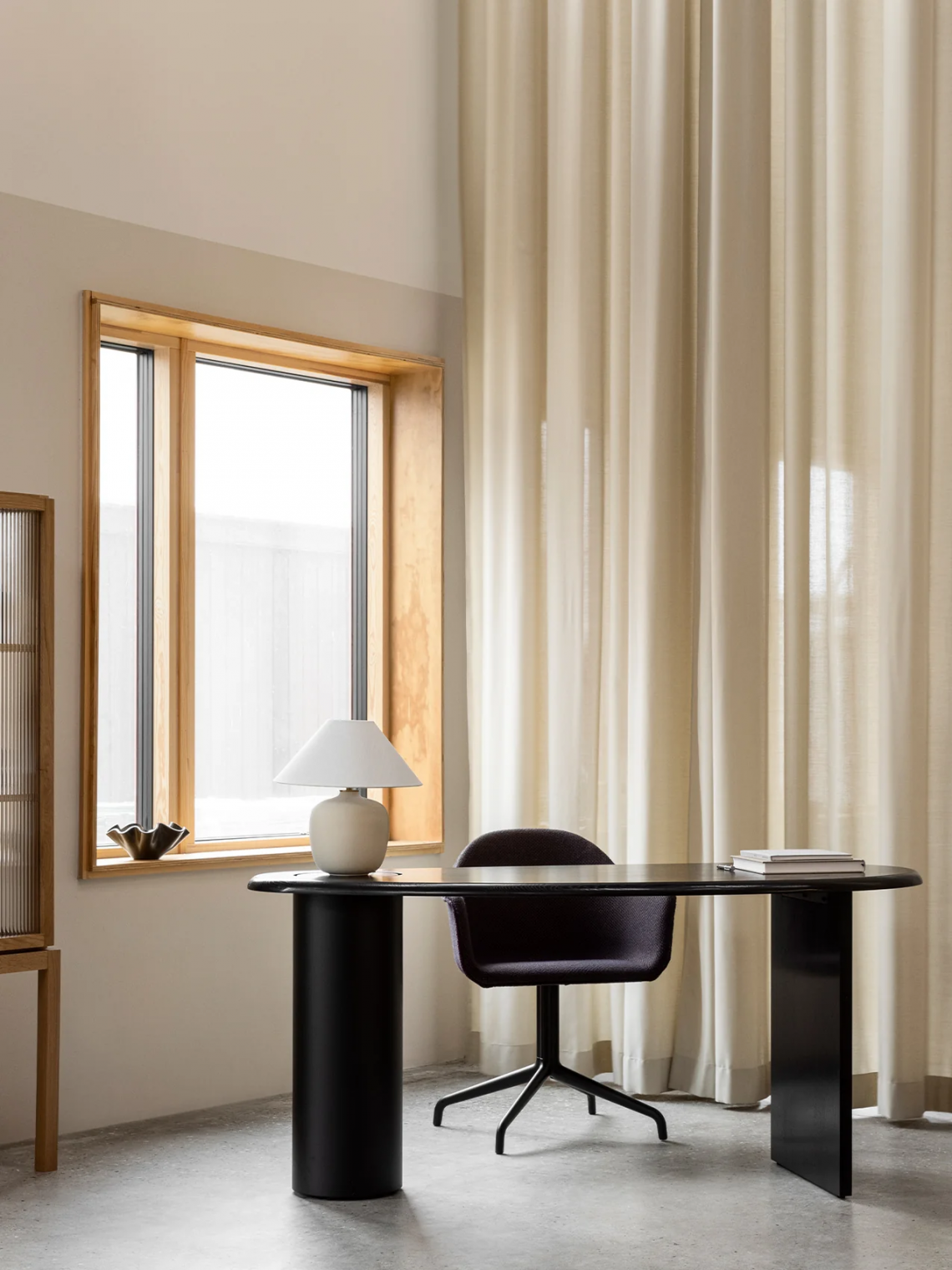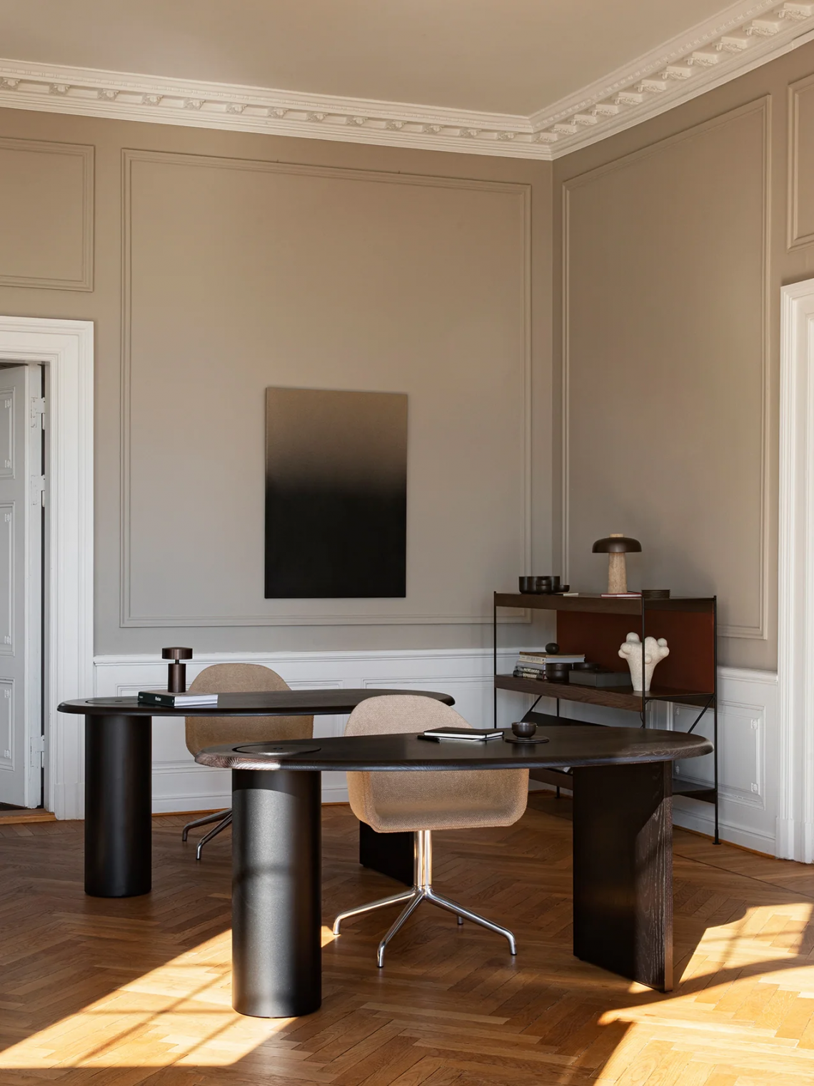 The Eclipse Desk is a celebration of materials and form. Named after its concave and convex form that resembles the illuminated passage of celestial bodies in the sky, the Fred Rigby design has a distinctive, asymmetrical silhouette that invites to touch. Available in solid oak, dark-oiled oak and oiled natural oak with a black painted leg, the tabletop is fitted with a lid that lifts to reveal hidden storage within the supportive steel column, ensuring desk space remains free of clutter. Designed to stand alone as a centrepiece in the middle of a room or for placement up against a wall as a more conventional piece of home office furniture, its intriguing form draws the eye.H: 75 cm, W: 160 cm, D: 80 cm