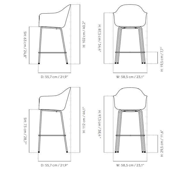 Whether you love to eat, work and hang out at the countertop bar, or prefer the elevation of the high top, the new bar and counter versions invite you to pull right up. The slender and sculptural geometric bases are designed with a comfy crossbar for the feet at just the right height to prolong comfort and keep your posture in top form. The bases are available in black powder coated steel. MENU offers various Harbour counter/bar Chair variants available for expedited delivery.