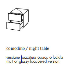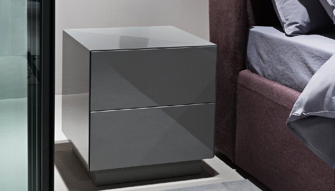 兩屜式木質(zhì)45度斜切處理的床頭柜。有一下飾面可供選擇-啞光漆-亮光漆-左側(cè)為亮面漆,右側(cè)和后部和抽屜為啞光漆。 頂部由45度“切割”設(shè)計(jì)分成右側(cè)/前部和光面漆,右側(cè)/后部則是啞光漆。