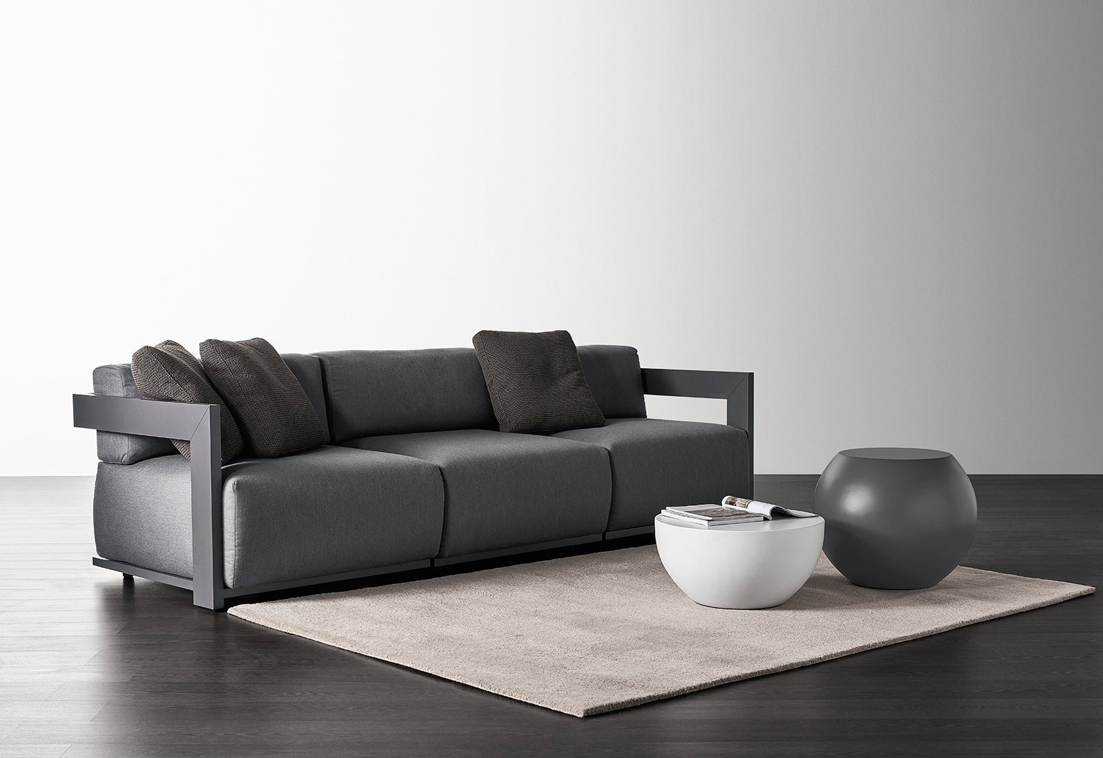 Modular sofa, armchair and lounge bed: the Claud collection stands out for its minimal design and soft cushions. Sophisticated and resistant, these furnishings are made of matt lacquered wood in different colours, that couples with soft paddings for an oasis of relaxation also in indoor environments.