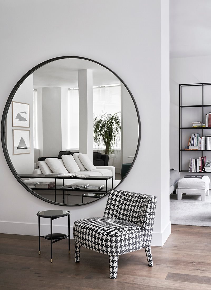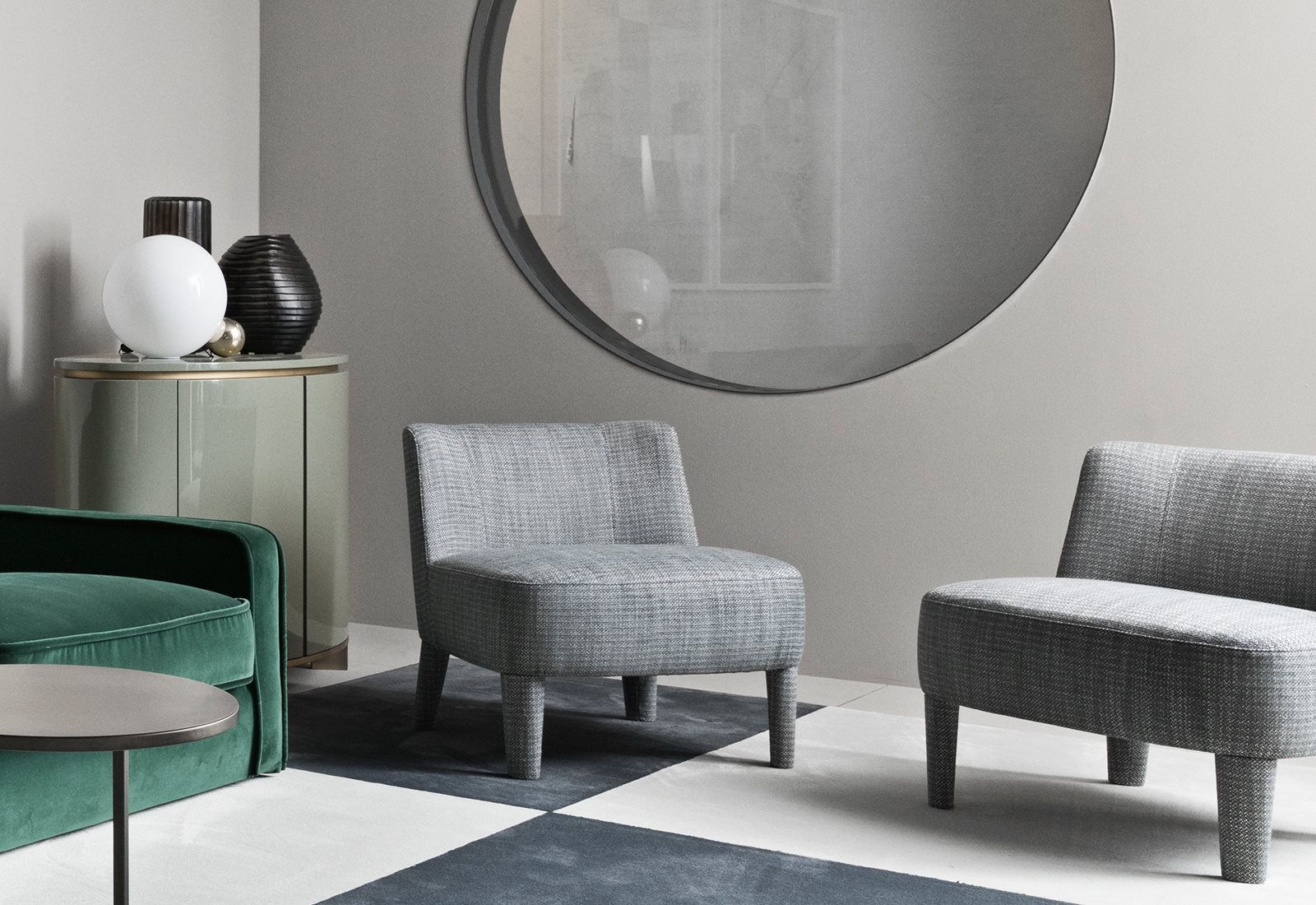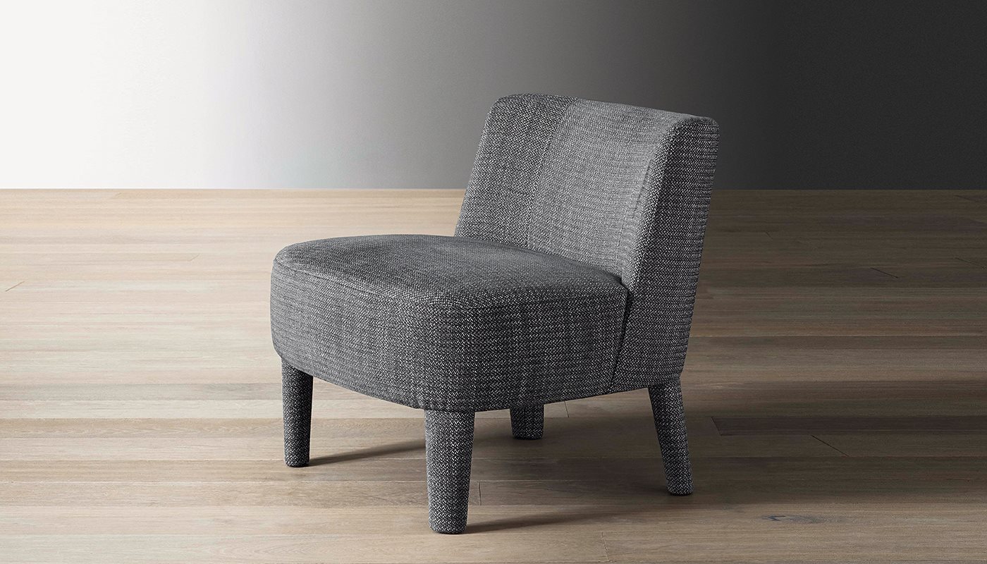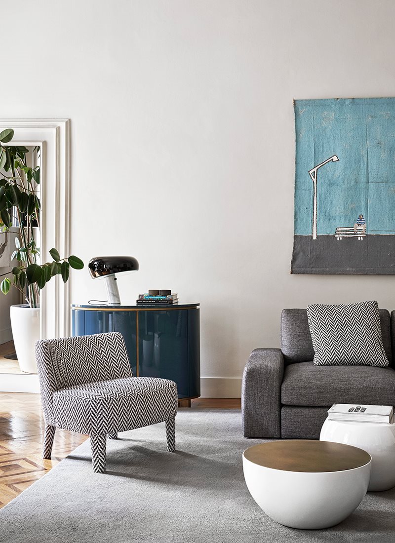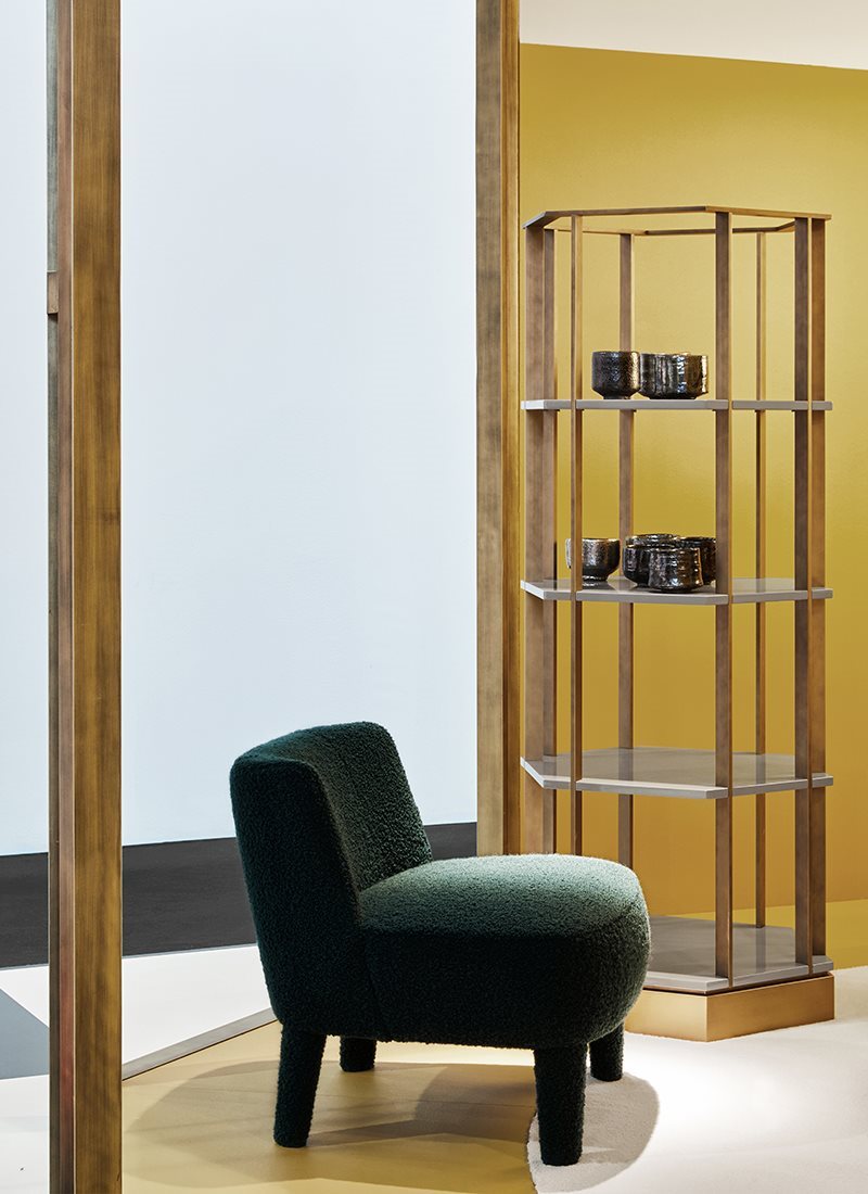一個軟包扶手椅的特點是包圍靠背,呼應(yīng) Cecile扶手椅的設(shè)計,但體型較小。