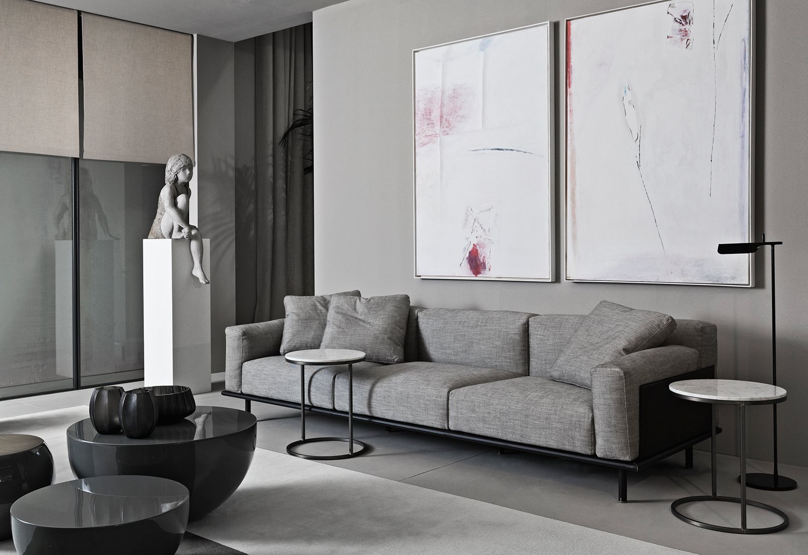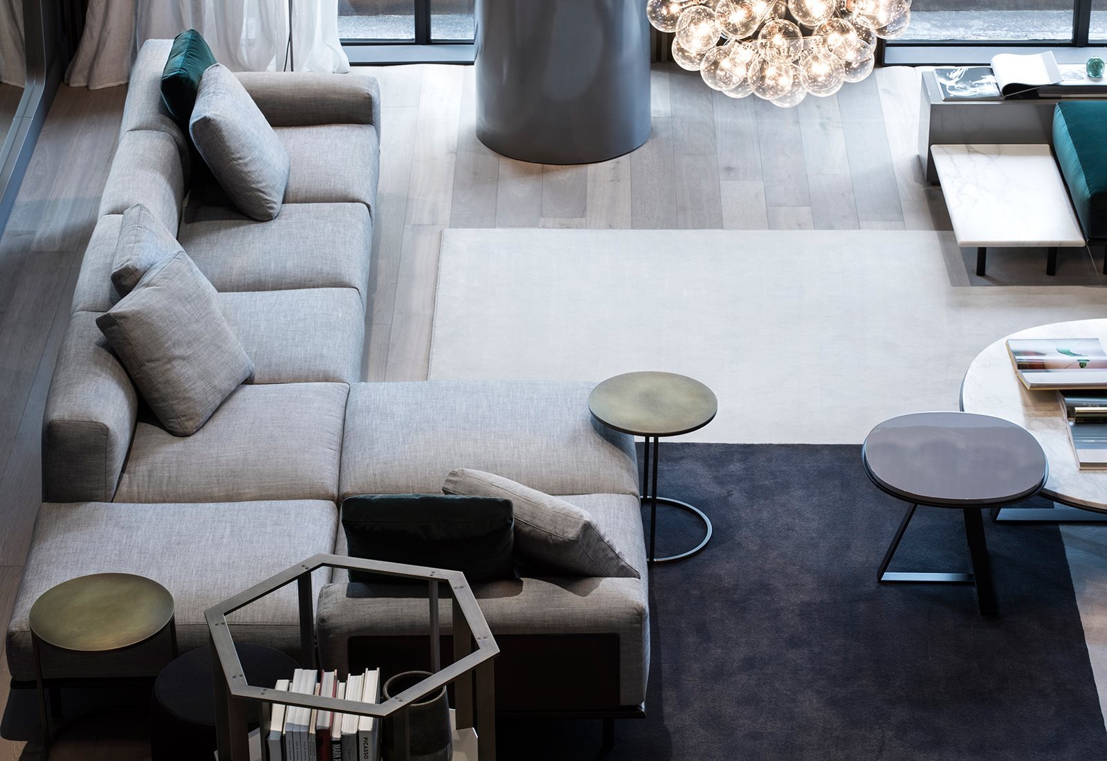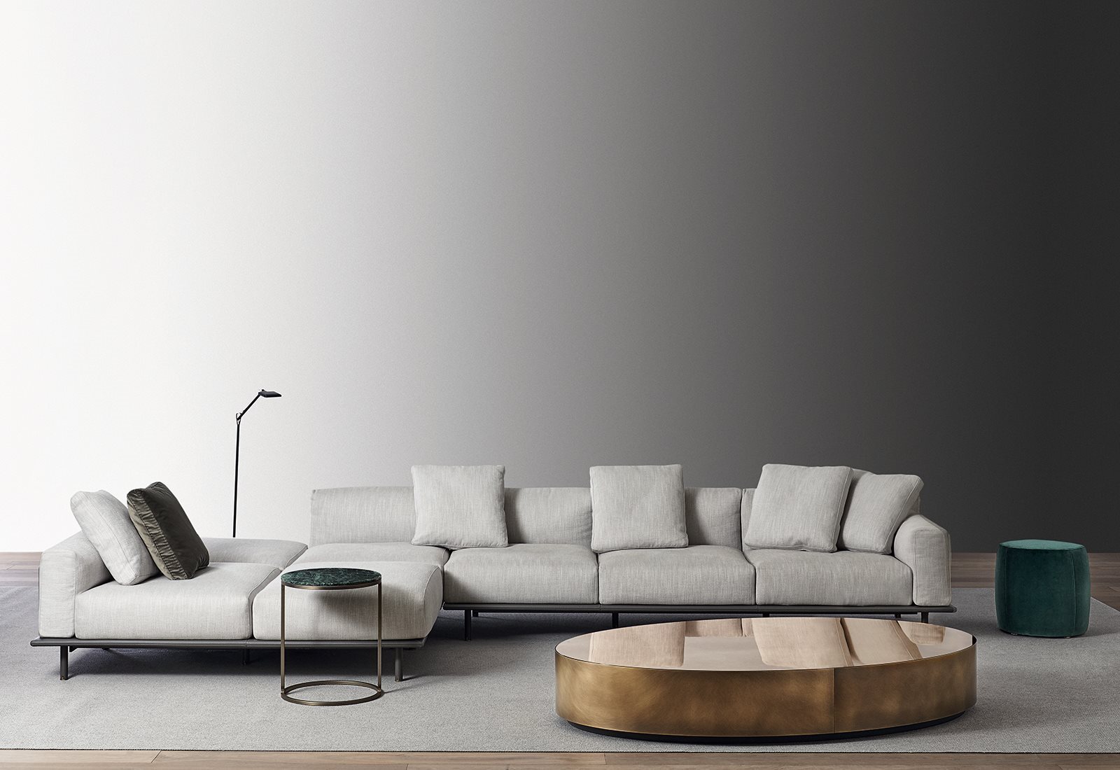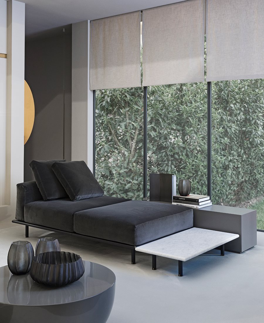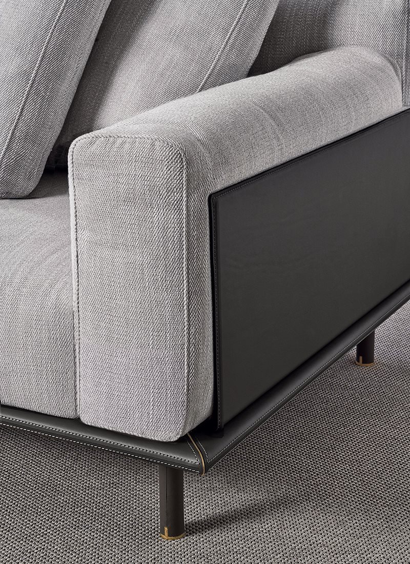 優(yōu)雅的比例沙發(fā),柔軟的靠墊和幾何線條通過復雜的建筑細節(jié)進行點綴:側(cè)面鑲板和馬鞍皮革覆蓋的底座由雙縫和黃銅型材制成。