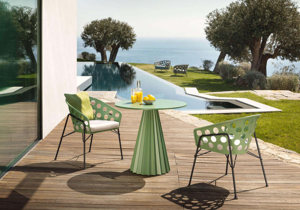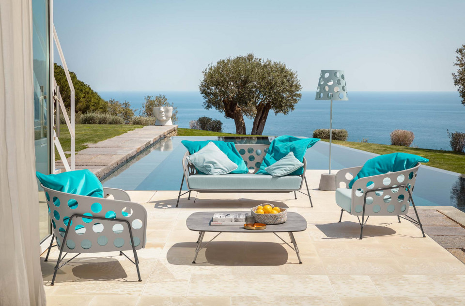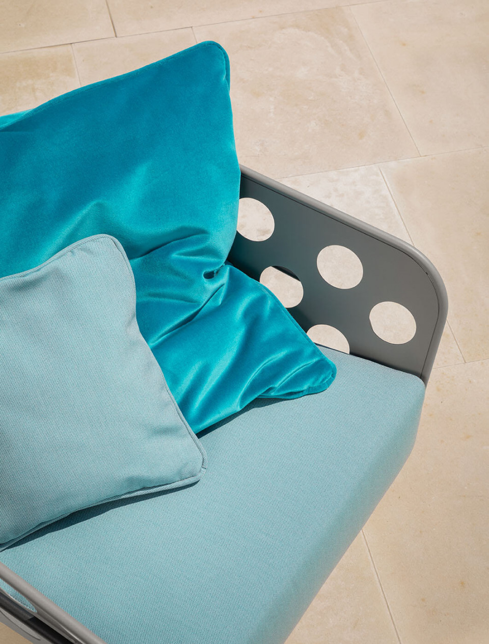 The Bolle collection was created for the outdoors and includes sofas, armchairs and lamps in macro-perforated colored metal, with a soft and playfully captivating aesthetic. The name Bolle derives from the special processing of the metal shells, which produces a texture with a strong graphic impact. Indeed, Bolle means bubbles.