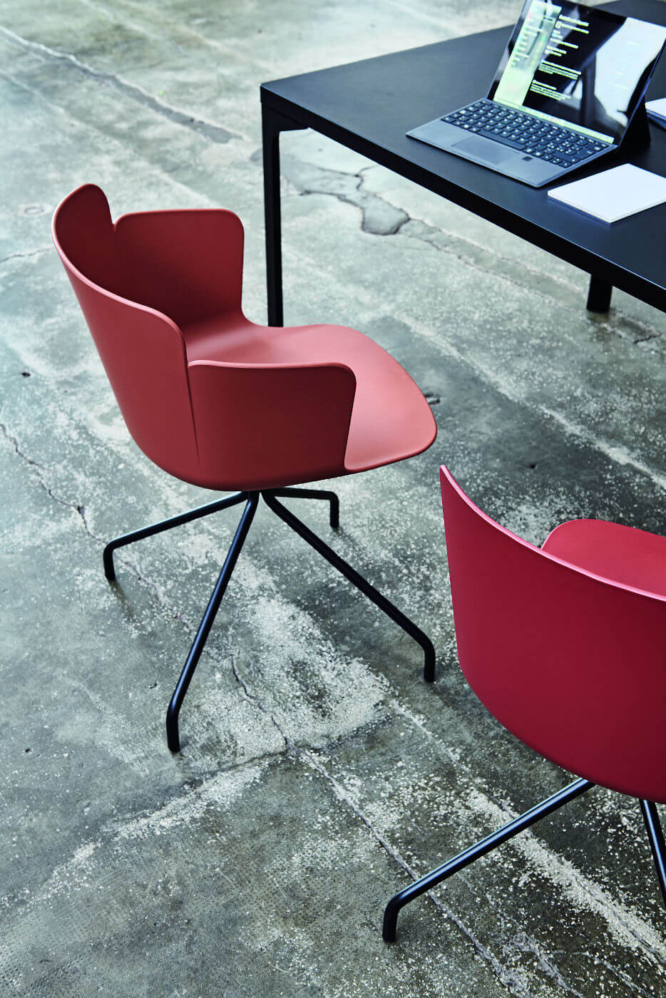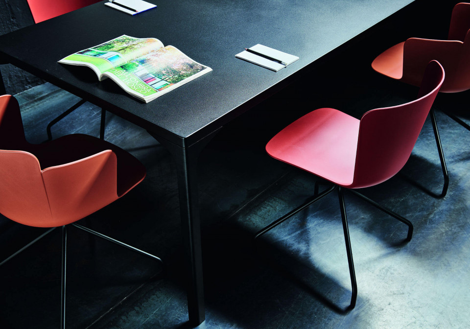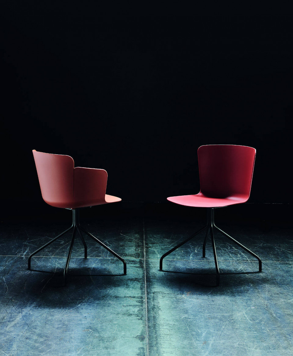 Calla armchair with four-legs base in lacquered steel. Polypropylene seat suitable for outdoor use. Optional: cushion in fabric, leather or faux leather.