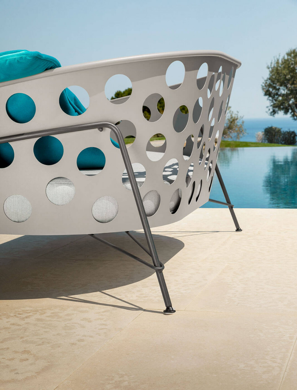 The Bolle collection was created for the outdoors and includes sofas, armchairs and lamps in macro-perforated colored metal, with a soft and playfully captivating aesthetic. The name Bolle derives from the special processing of the metal shells, which produces a texture with a strong graphic impact. Indeed, Bolle means bubbles.
