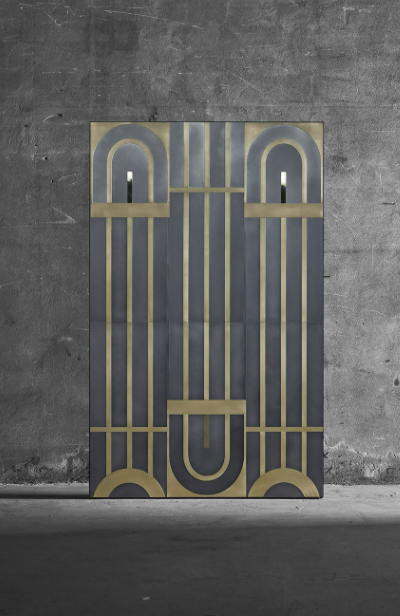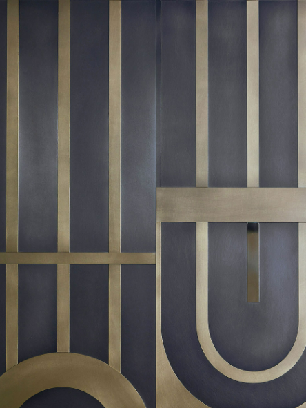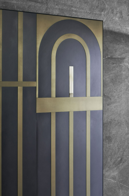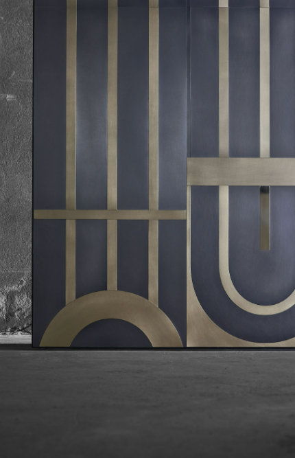 Rivestimento per pareti ispirato alle cancellate degli storici palazzi di Milano anni ’30. Un disegno continuo, adattabile a qualsiasi dimensione, ideale per hotels, boutique e in generale i grandi ingressi. Il rivestimento lavora su piani differenti, per enfatizzarne le forme e sottolineare il decoro.