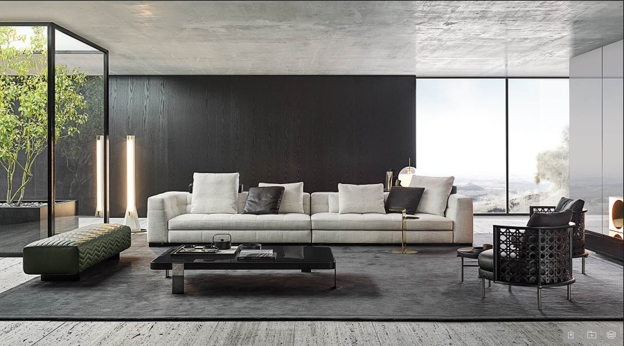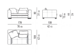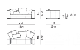 The system, composed of pieces that can be used alone or combined together, offers a variety of compositional solutions thanks to the high versatility of its elements. The family is composed of armchair, sofa, end element with or without extending top, chaise-longue, loveseat, daybed with reclining backrest, and square and rectangular coffee tables.