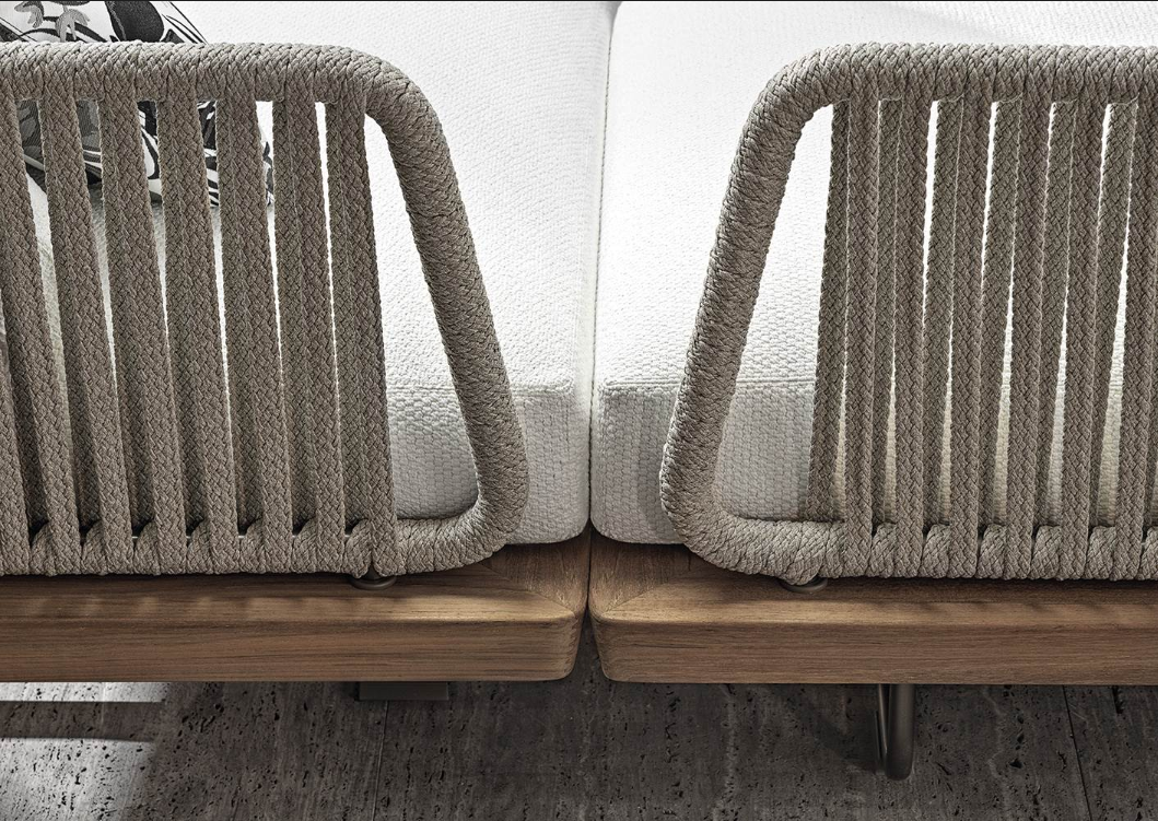 It juxtaposes different shapes and materials: its airy surface in natural teak wood defines its horizontal line, while the curved backrest with interwoven cords gives it a dynamic allure.