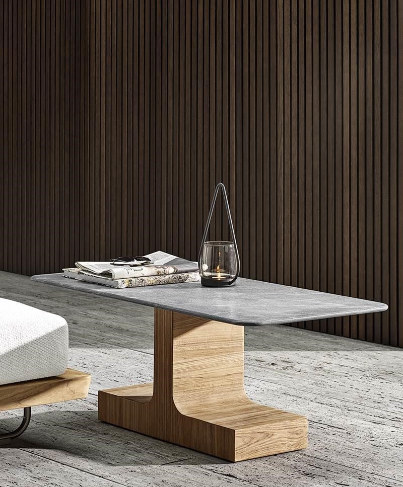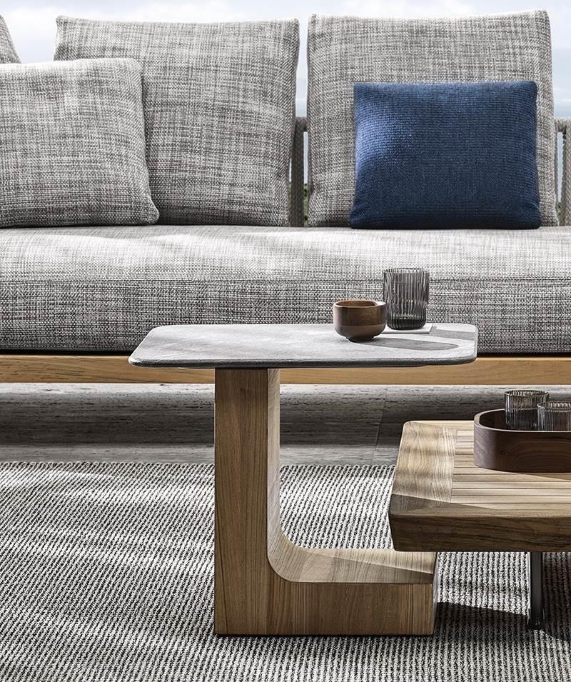 Structured in the form of a block of solid wood, the base of the Outdoor version of the Block coffee table retains its solid volume in the shape of an “L” or an upside-down “T”, but it is proposed in natural teak.