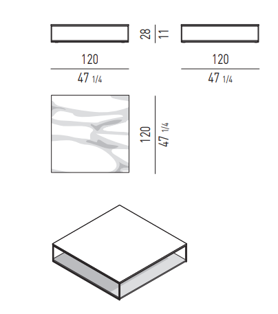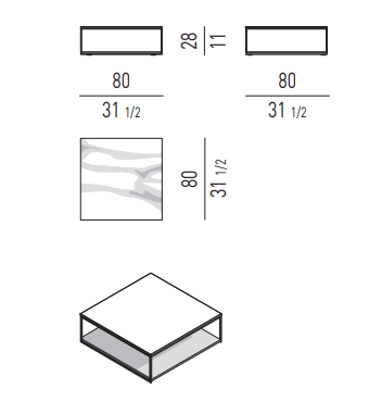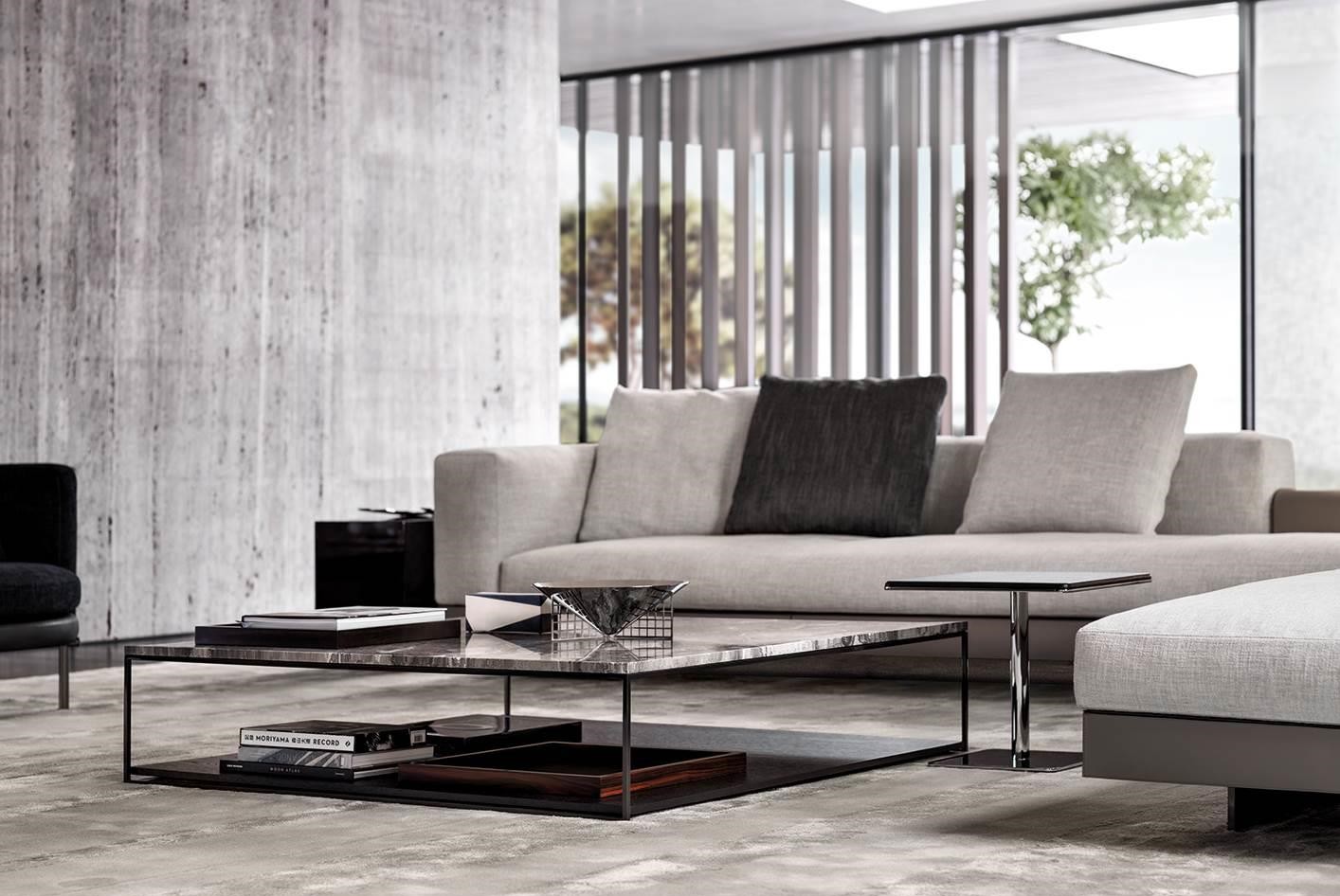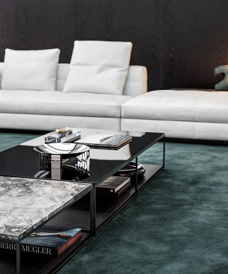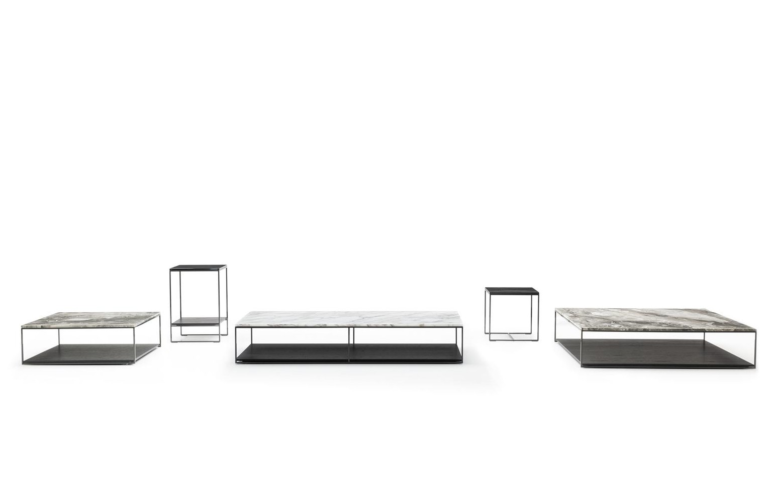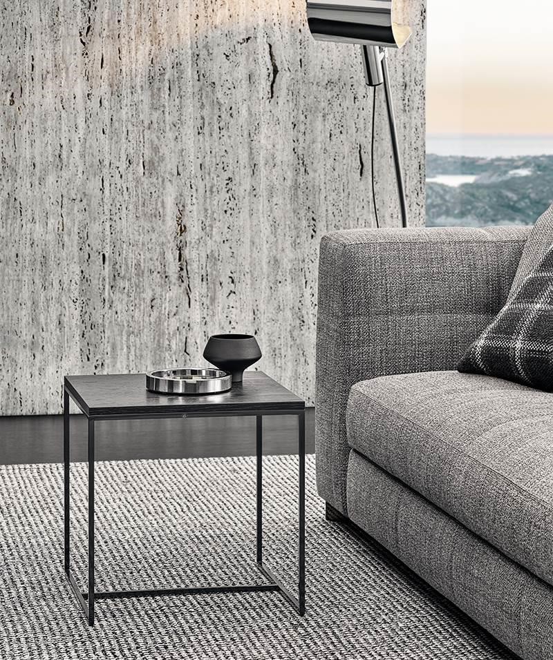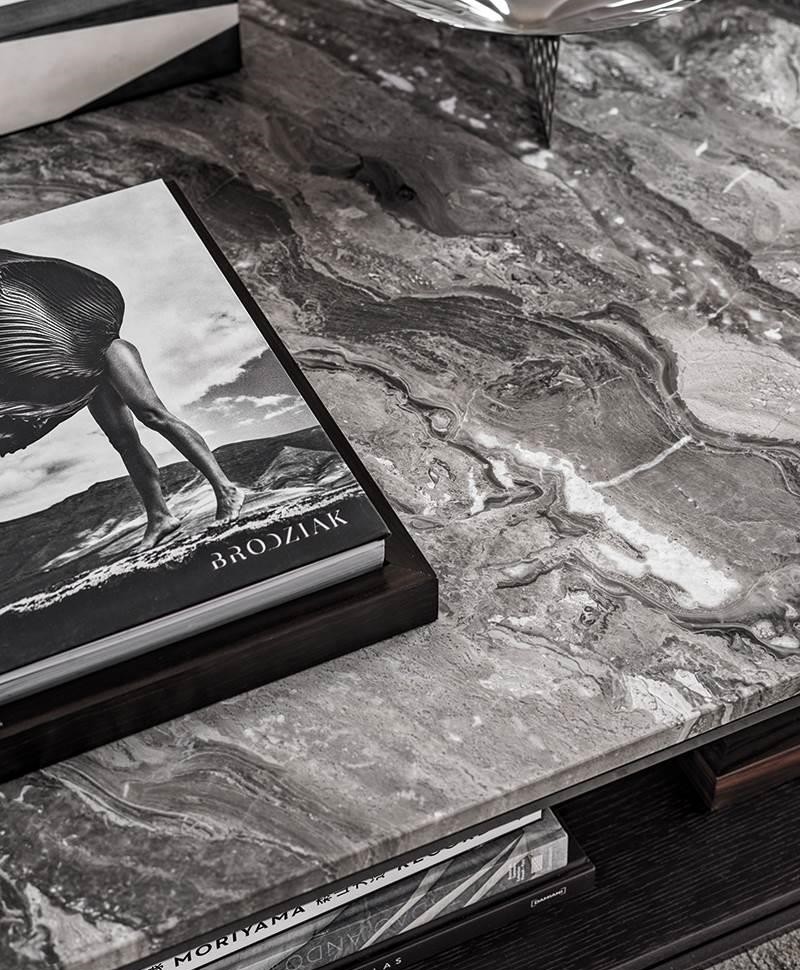 The family of Liam coffee tables is characterised by the airy 1 cm square steel structure, which designs a lightweight volume, defined by a polished Pewter colour finish. It hosts a top in Calacatta marble, Grigio Orobico marble, Black pate de verre glass or brushed oak with Moka colour lacquer finish. In some elements, it also accommodates a lower, wooden surface for holding books, magazines and objects, also in brushed oak with Moka colour lacquer finish.