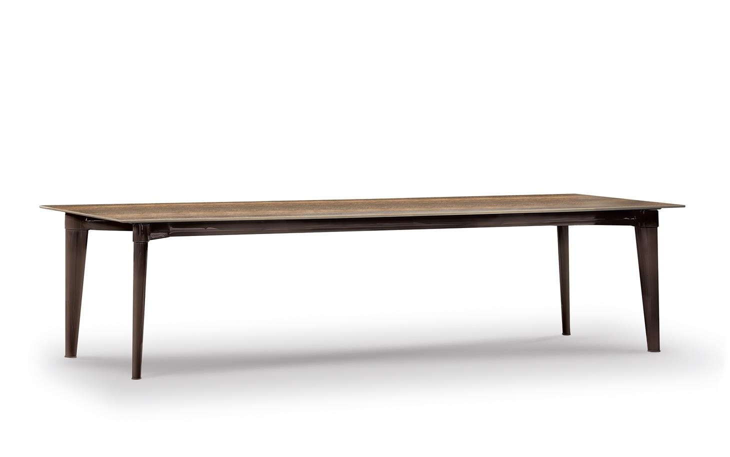 The colour of the legs in polished Pewter and the choice of a textured, pictorial wood define its sophisticated elegance, revealing an apparently minimalist, linear design. The tapered leg, also featured on the outdoor Terrace table designed by Rodolfo Dordoni, endows the piece with dynamism and a sensation of absolute lightness.