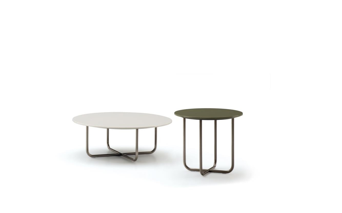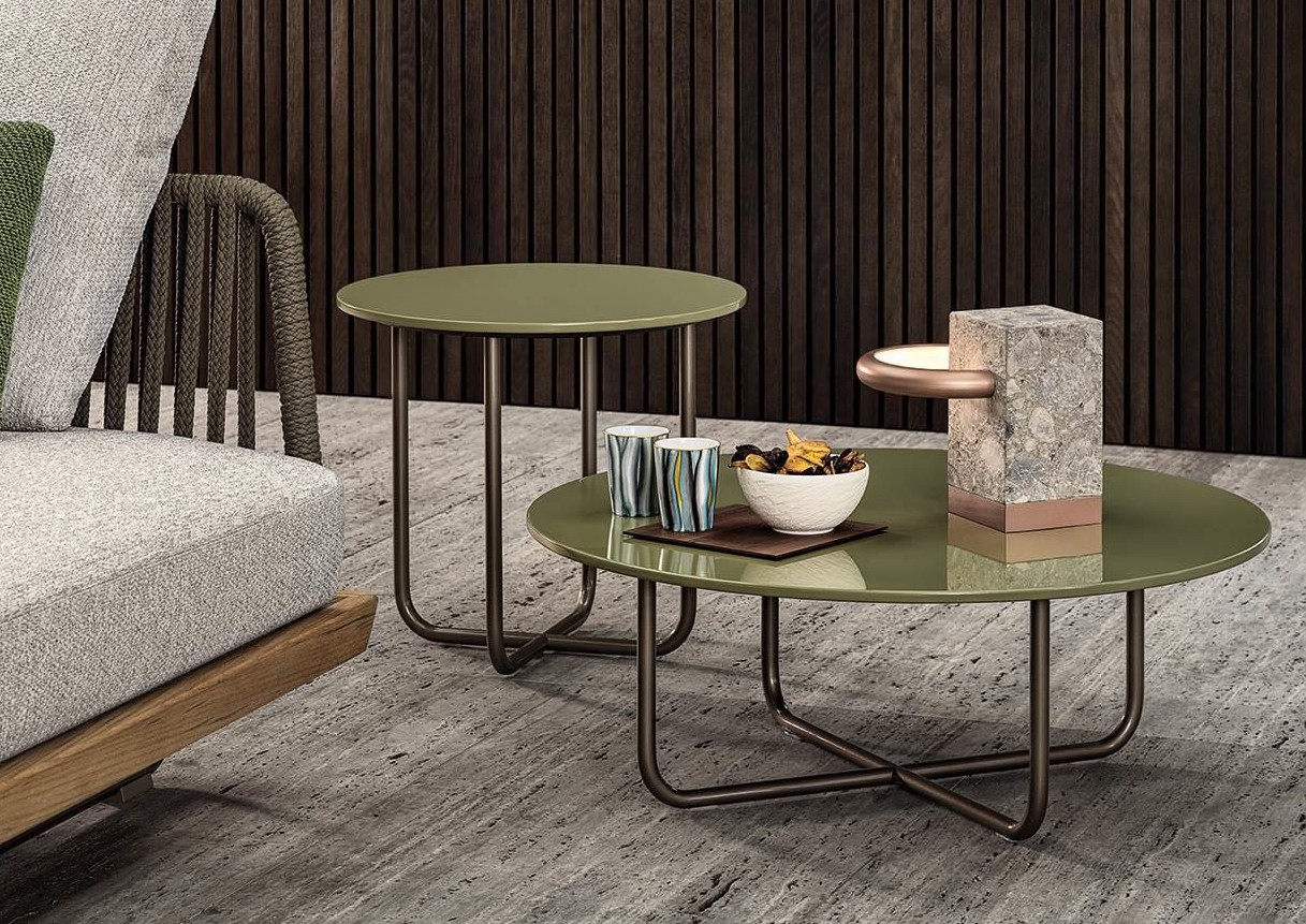 Its distinctive feature is the colour of the top in stratified HPL laminate, available in glossy lacquered White, Rust and Khaki Green finishes, blending in seamlessly with the palette of the outdoor textile collection.