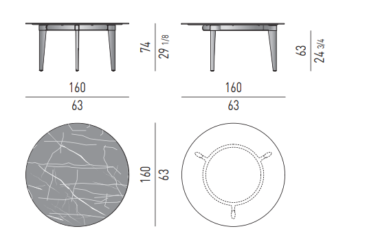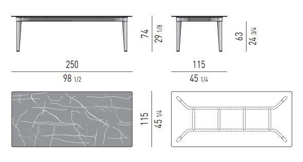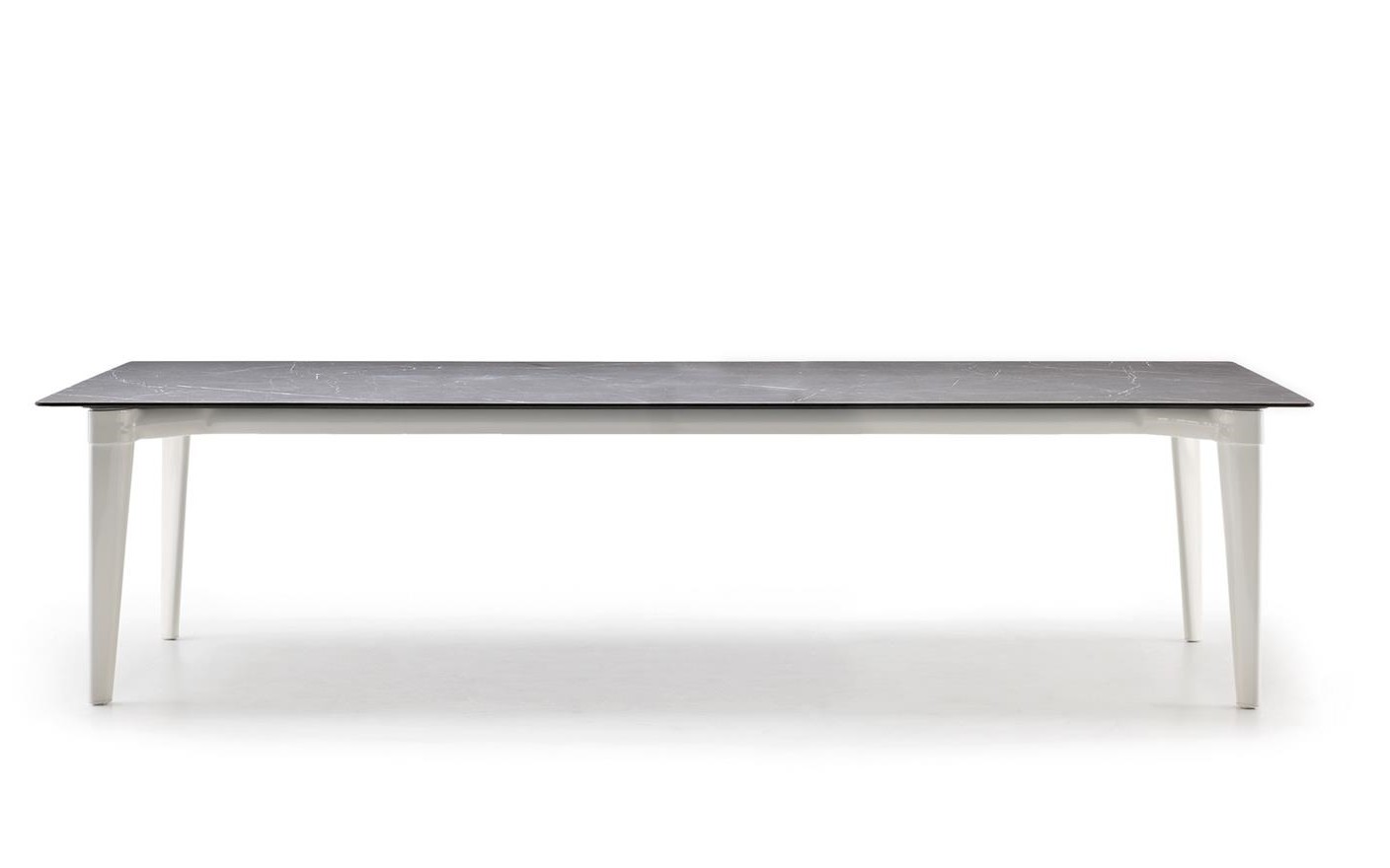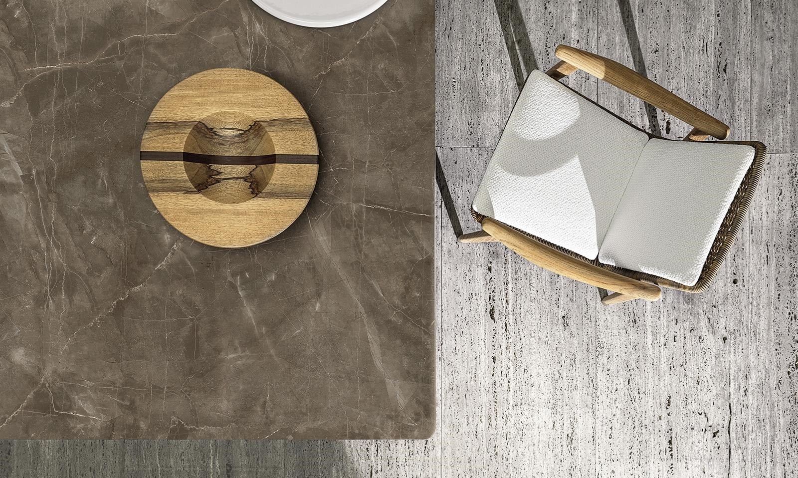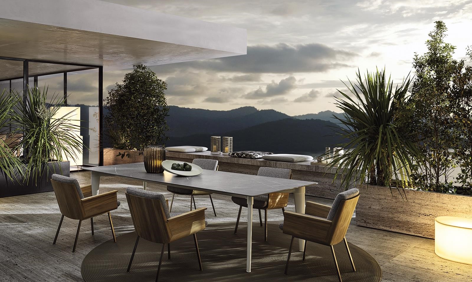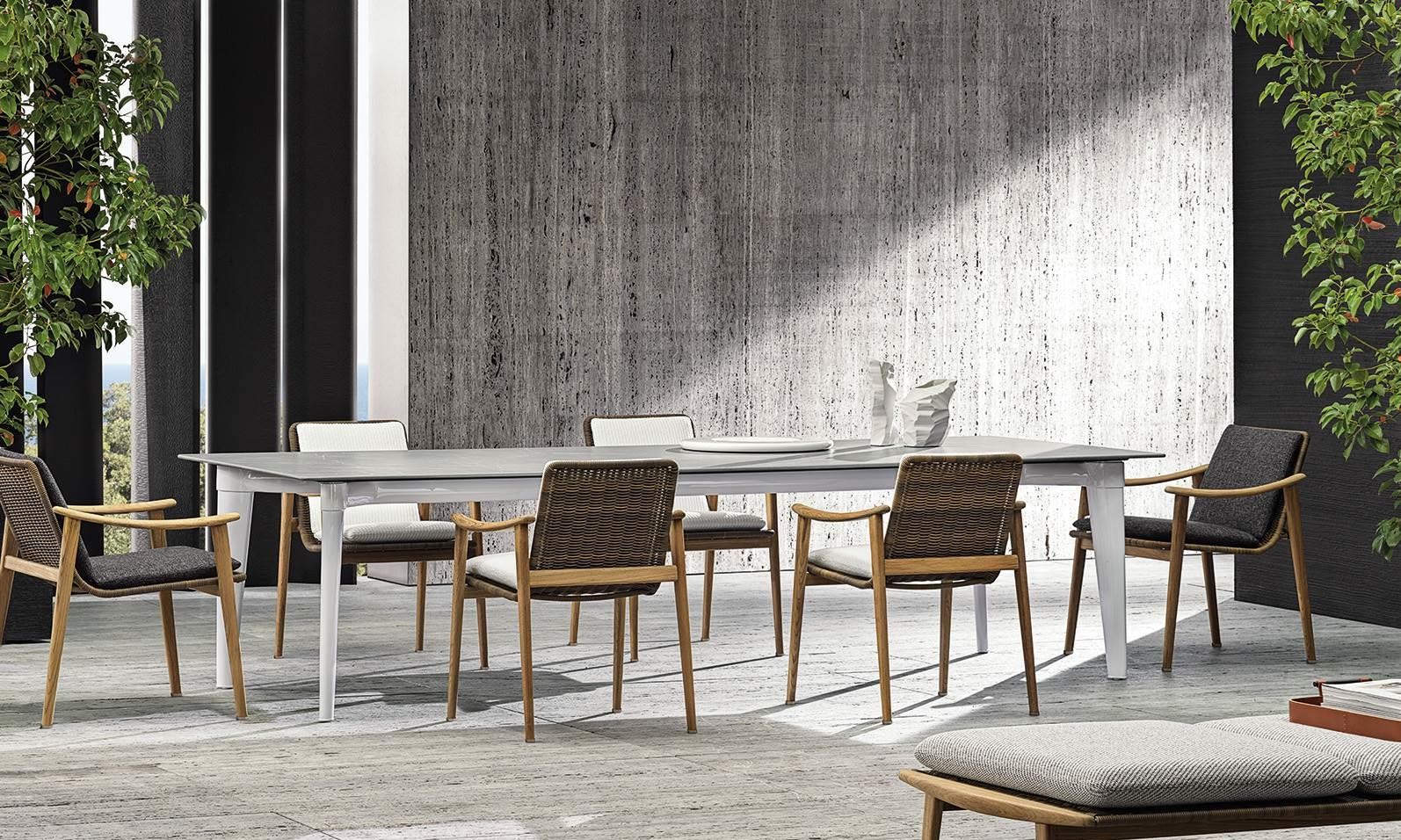 Tapered legs, with a soft, retro-inspired aesthetic and a stone-effect ceramic top, are the distinguishing features of the Terrace table, designed for use in open-air living spaces.