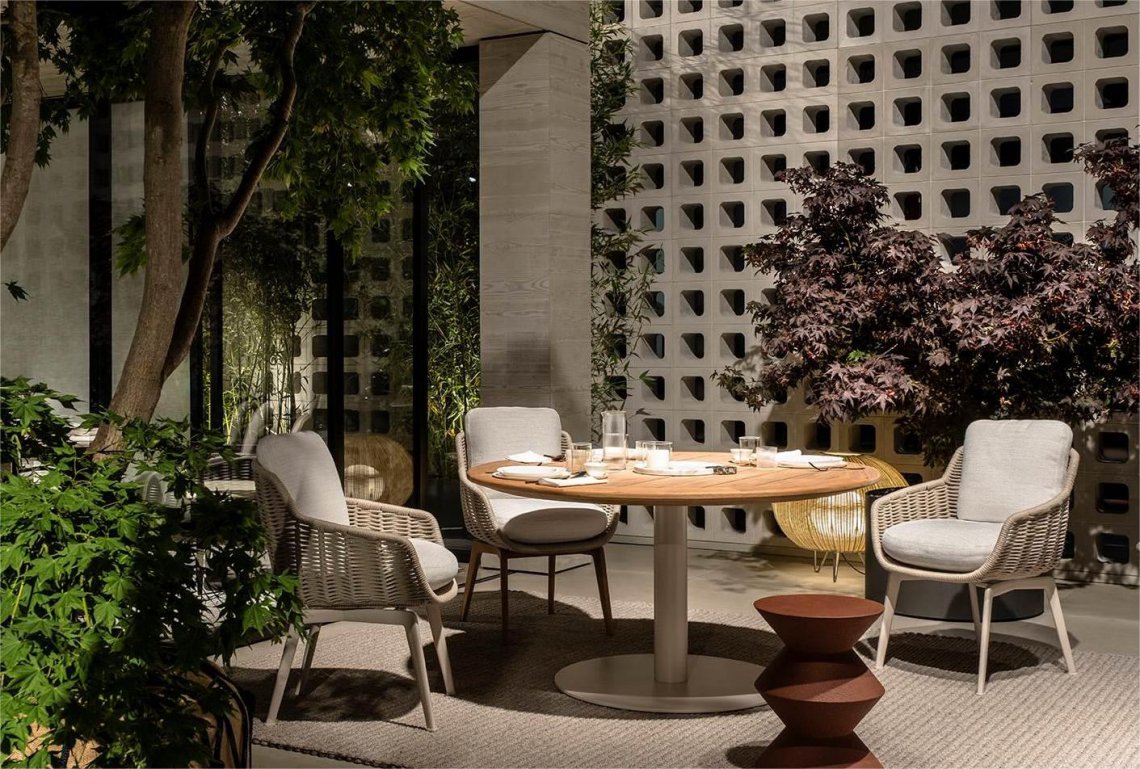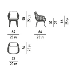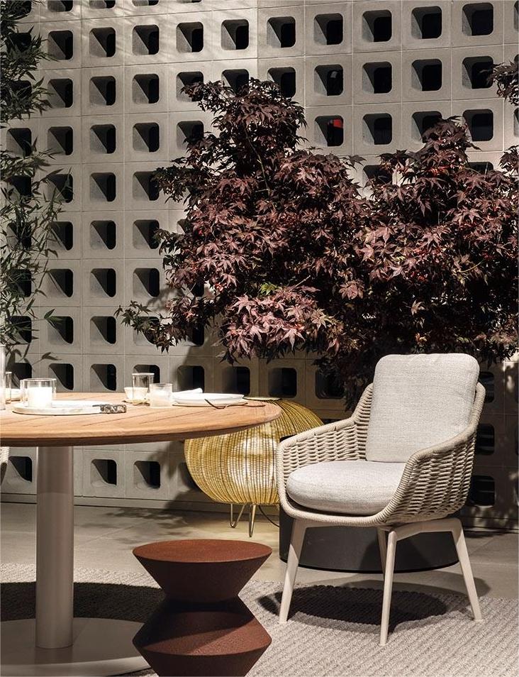 The seats rest on a matt varnished aluminium base, in the shades of Ecru and Dark Brown, reiterating the colours of the cord, and feature padded cushions with extra-durable polyurethane foam inserts, covered in water-repellent fibre and fabric.
