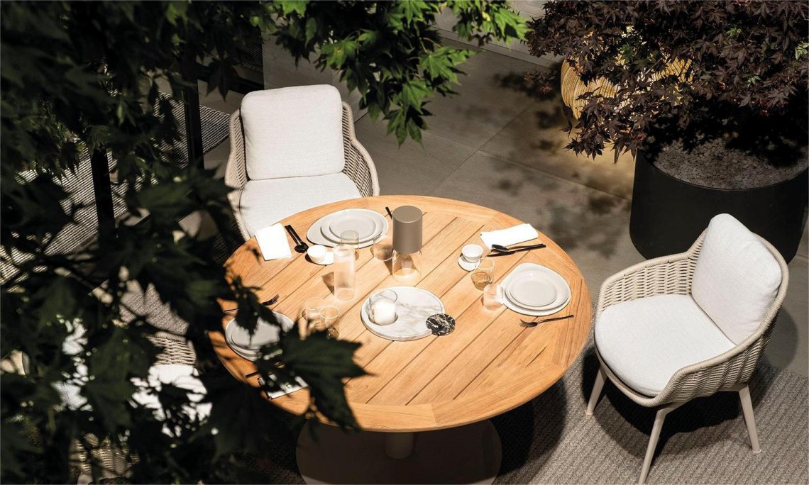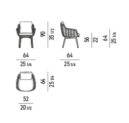 The seats rest on a matt varnished aluminium base, in the shades of Ecru and Dark Brown, reiterating the colours of the cord, and feature padded cushions with extra-durable polyurethane foam inserts, covered in water-repellent fibre and fabric.