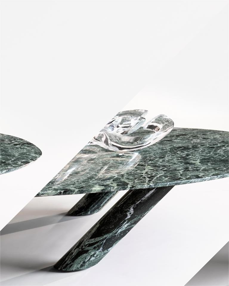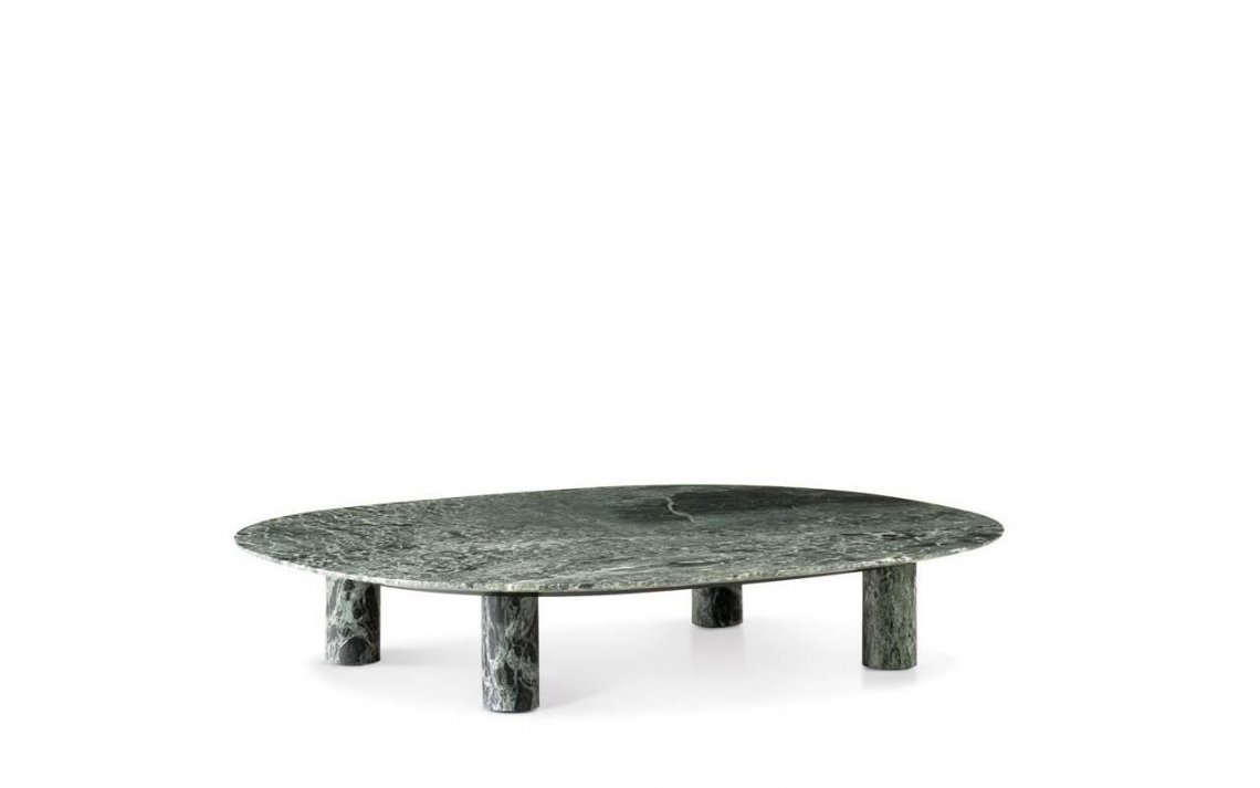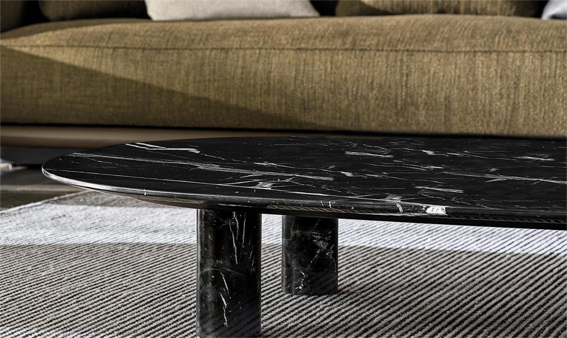 The Gladstone coffee table is the harmonious and refined embodiment of the entire 2022 Collection, characterised by a precise stylistic identity that combines a Scandinavian soul with Japanese aesthetics. Its base recalls the organic forms of Nordic design with clear inspiration from the 1970s: four solid cylindrical legs support an oval top which, thanks to its flared detail, appears thin and light, creating a pleasant contrast between the consistency of the marble material and the visual lightness of the coffee table.
