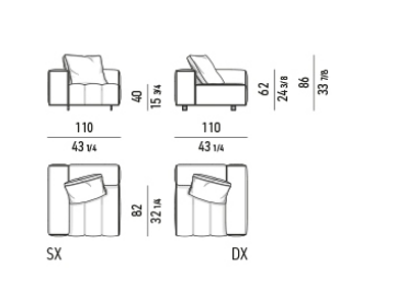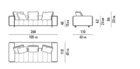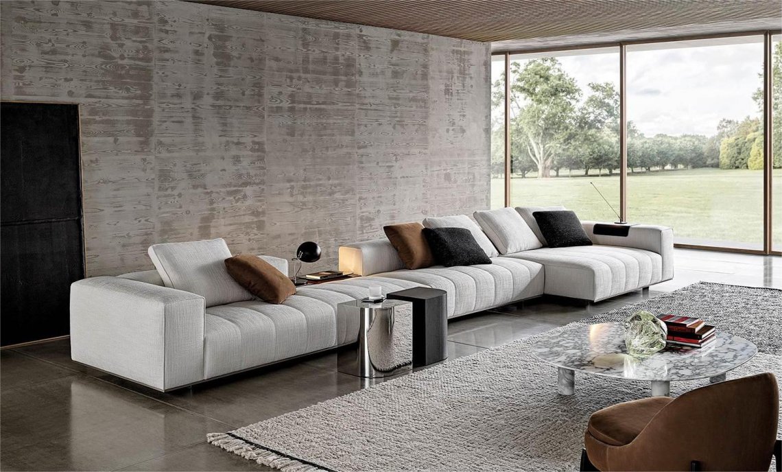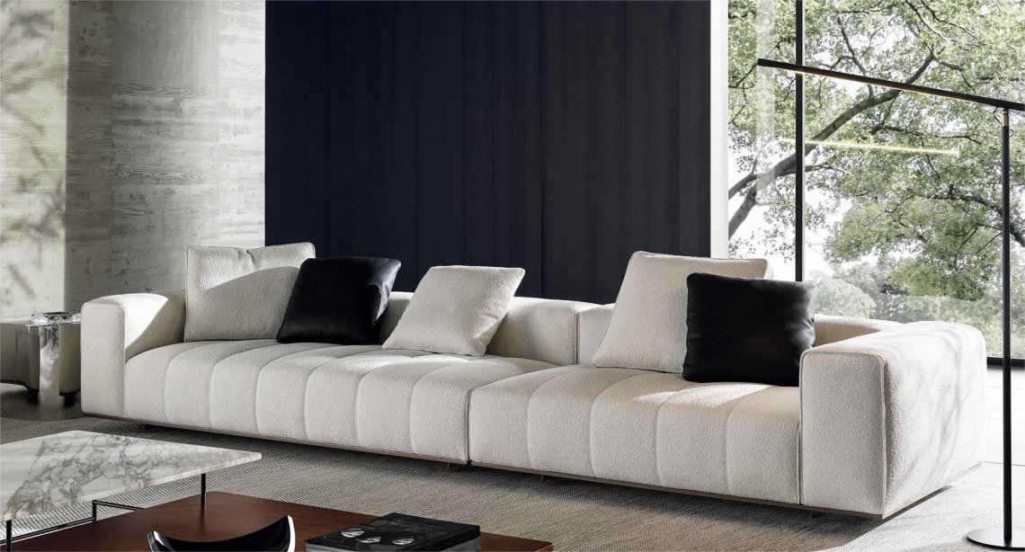 The system is suspended from the floor on refined Bronze or Polished Chrome metal feet, set back from the edge, and a perimeter frame that matches the same finishes; the optical effect of suspension in Goodman enhances the softness of the seat, offering a super-comfortable welcome. The volume of the one-piece seat is particularly ergonomic and comfortable thanks to the use of the innovative technology used: the system of pocket springs is combined with a layer of polyurethane padding in layered densities that give a consistent sensation of softness and cosiness.