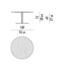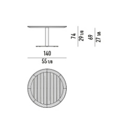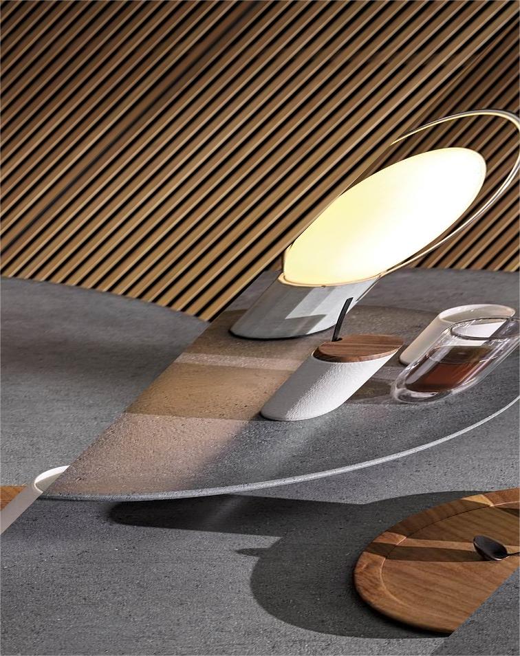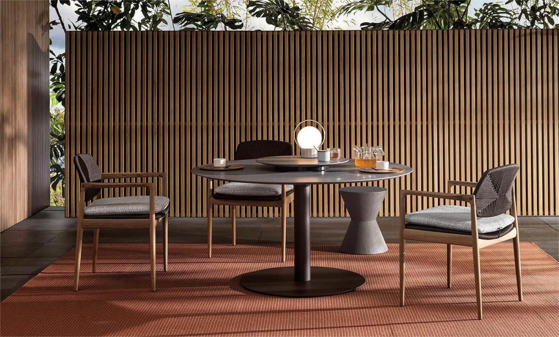 The contoured and fine-grain polished Basaltine stone version undergoes a unique stain-resistant treatment and has a stainless steel base with a polished Pewter, matt Ecru or matt Dark Brown epoxy paint varnish that guarantees colour stability over time. The variant with a teak top in a natural finish has a structural stainless steel frame, varnished matt Ecru or Dark Brown colour to match the finish of the base.