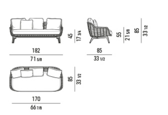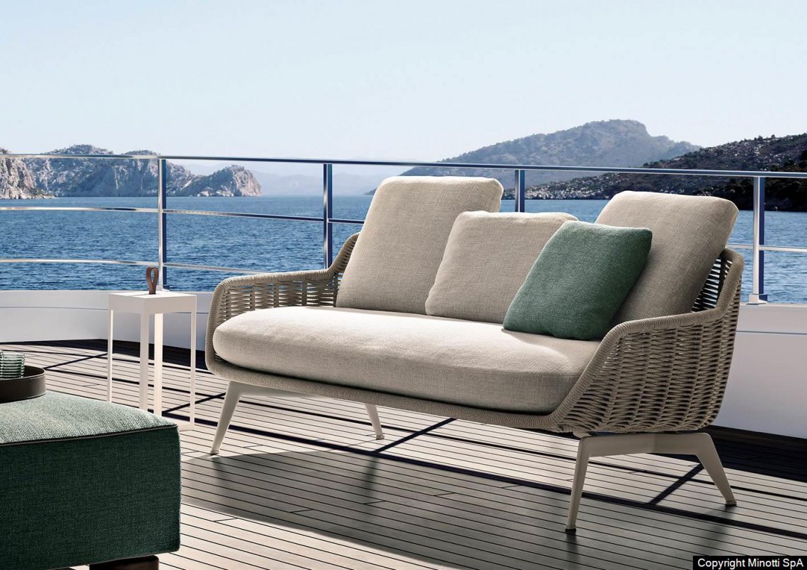 The seats rest on a matt varnished aluminium base, in the shades of Ecru and Dark Brown, reiterating the colours of the cord, and feature padded cushions with extra-durable polyurethane foam inserts, covered in water-repellent fibre and fabric.