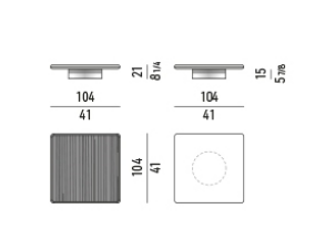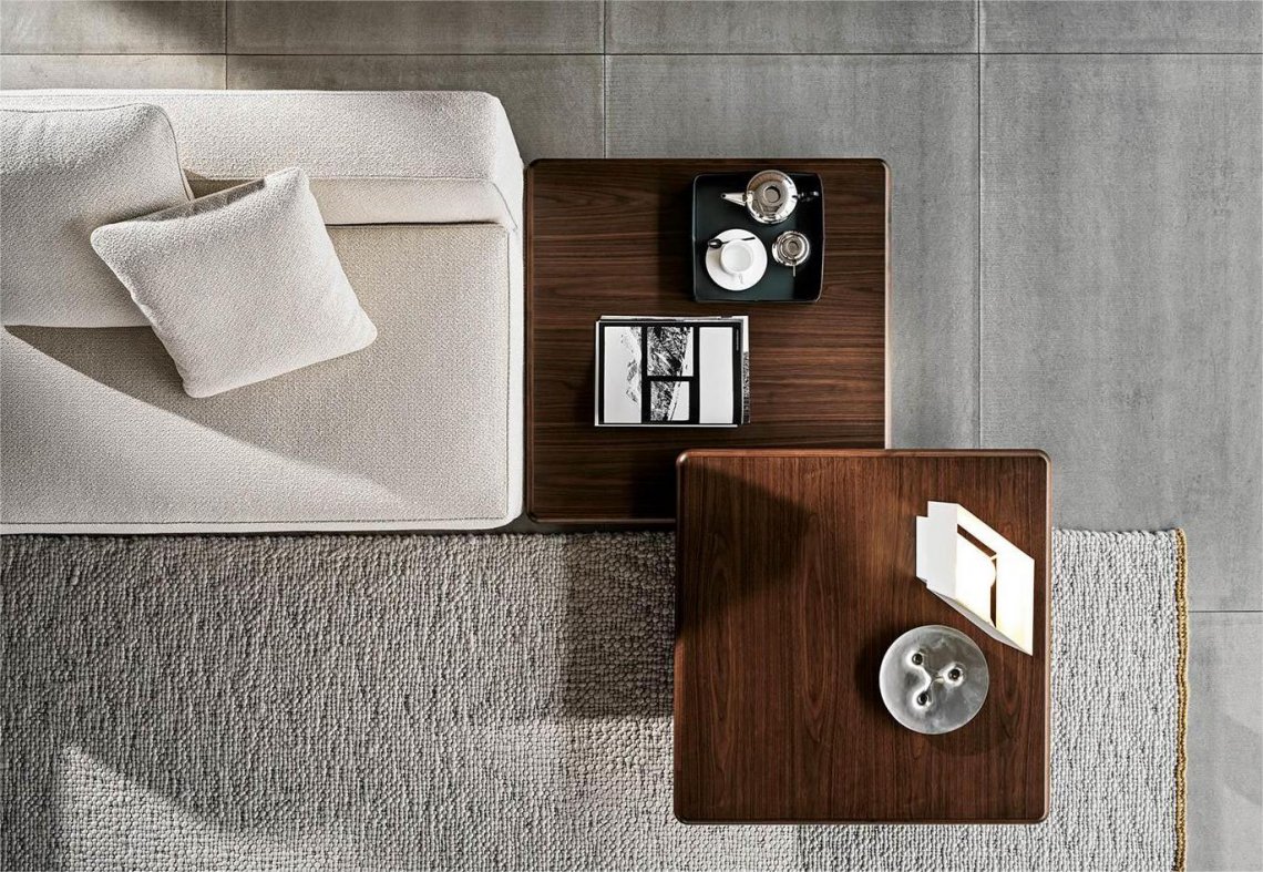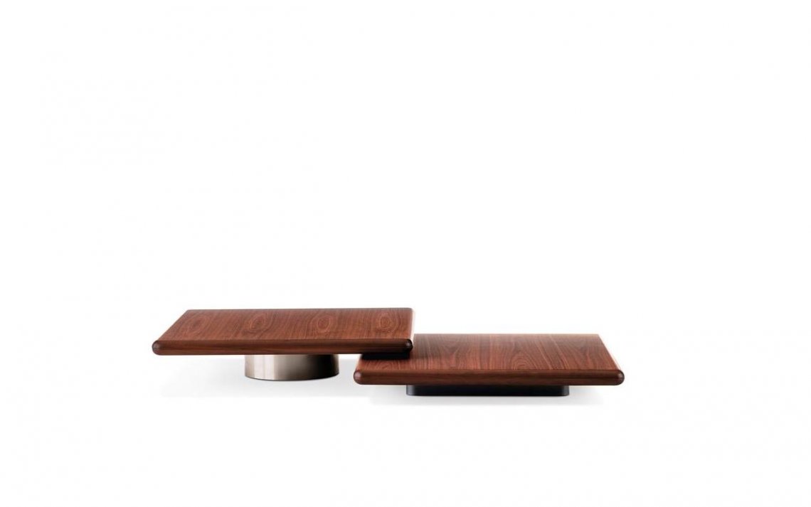 The coffee and side tables also reflect the same style, with floor support in polished Bronze varnished metal and tops in Dark Brown stained Canaletto walnut or Liquorice coloured ash. The different sizes and heights of the coffee and side tables allow for a play of superimpositions that invigorates the horizontality of the entire family.
