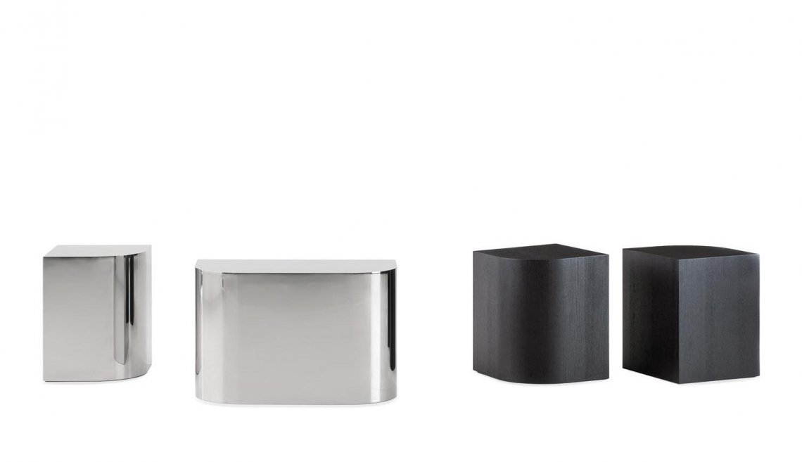 The James coffee table stands out for its sculptural form: a monolith in Liquorice-lacquered ash or in mirror-finished polished steel.