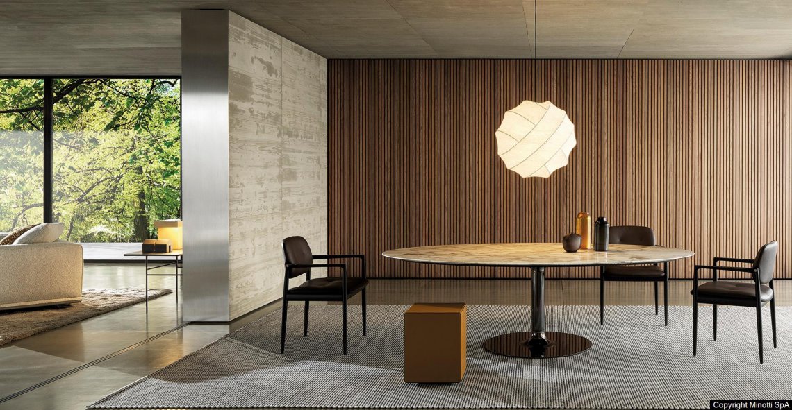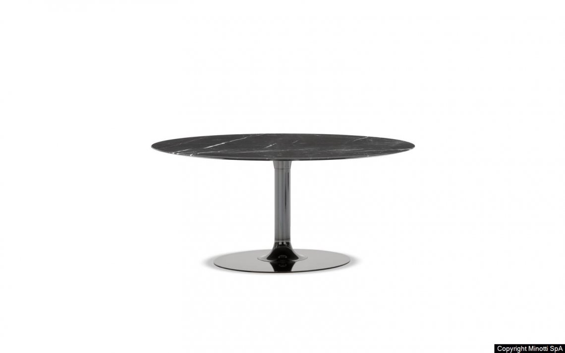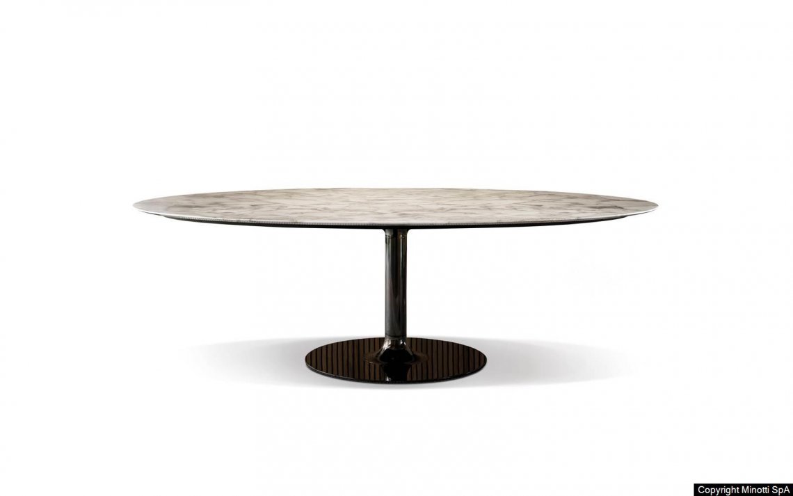 Oliver fully interprets the classic contemporary value characteristic of the Minotti style code in every setting. Today, this series of dining and lounge tables is further expanded with the introduction of the Arabescato Grigio marble top for all sizes and the Canaletto walnut stained Dark Brown. For the lounge version, the new 145 cm and 180 cm diameters and 66 cm height have been added, while the dining version 145 cm diameter and 73 cm height and the oval version 240x140 H73 cm are now also available.