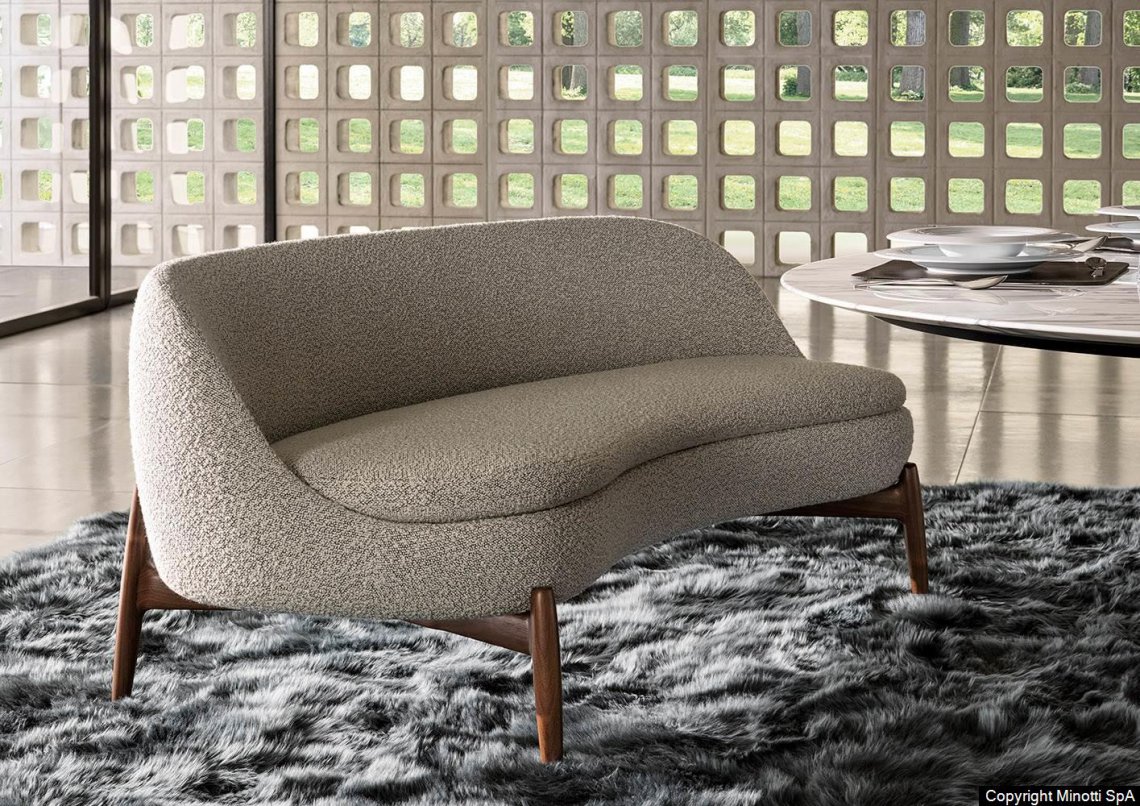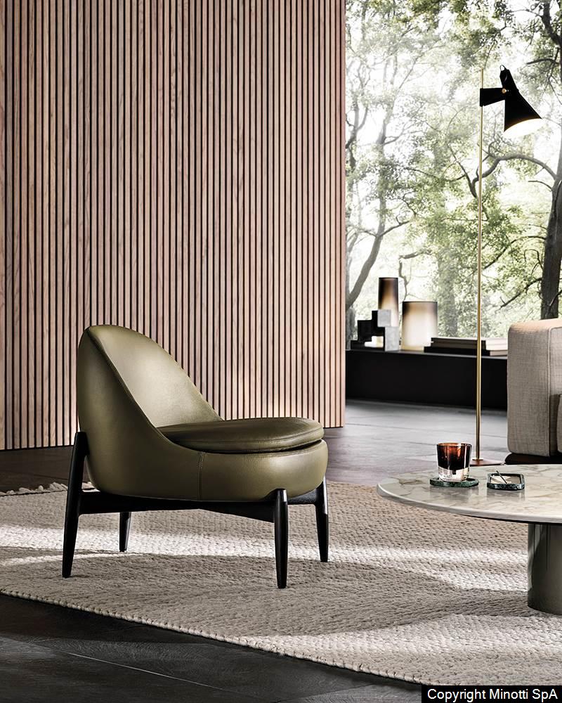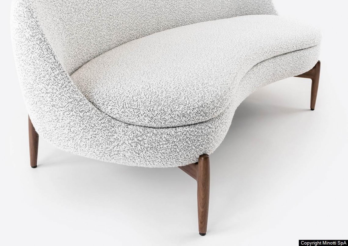 Like slender trunks, the elegant, polished legs, in Canaletto walnut solid wood stained Light Brown, or Liquorice lacquered ash, rest on the ground, lifting the enveloping upholstered body and creating a soft rhythm of vertical lines.