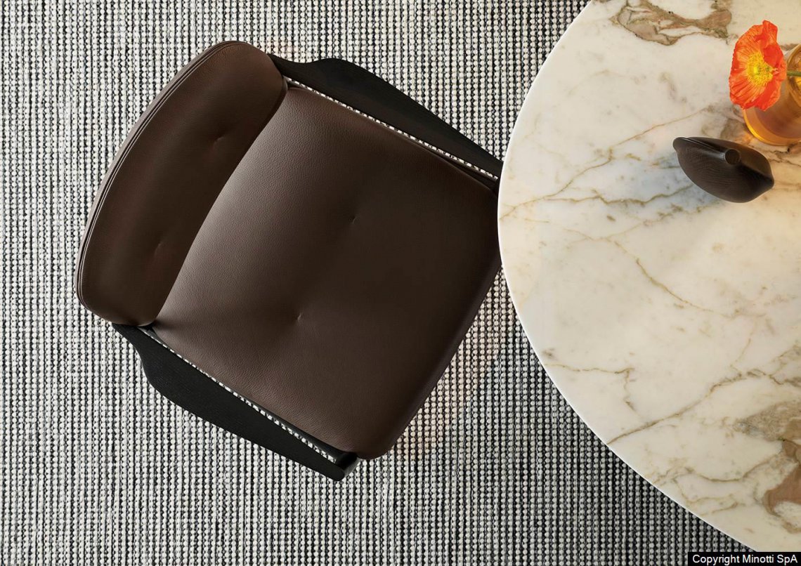 Delicate and sinuous lines, created with precious cabinet-making interlocking techniques that enrich the structure of legs and armrests in solid ash open pore wood lacquered with a Liquorice colour, or in solid Canaletto walnut stained Light Brown, a chromatic choice that lends a more decisive tone to the elegance of the silhouette.