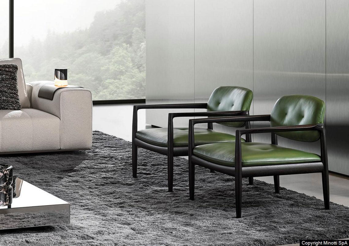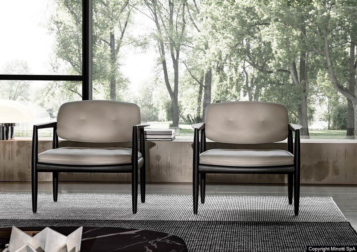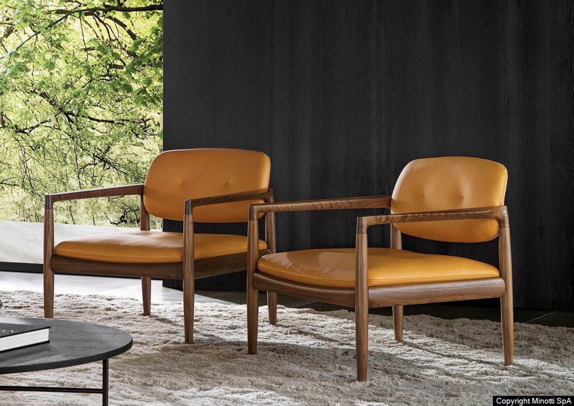 The wooden frame has a joint where the leg meets the armrest, both at the front and at the back: a structural joint that becomes decorative thanks to the clever use of the wooden material. In this project, the great expertise in woodworking that has always been characteristic of Nordic and Japanese craftsmanship meets the historical know-how of a Made in Italy company that has been an expert in exquisite upholstered furniture for decades.