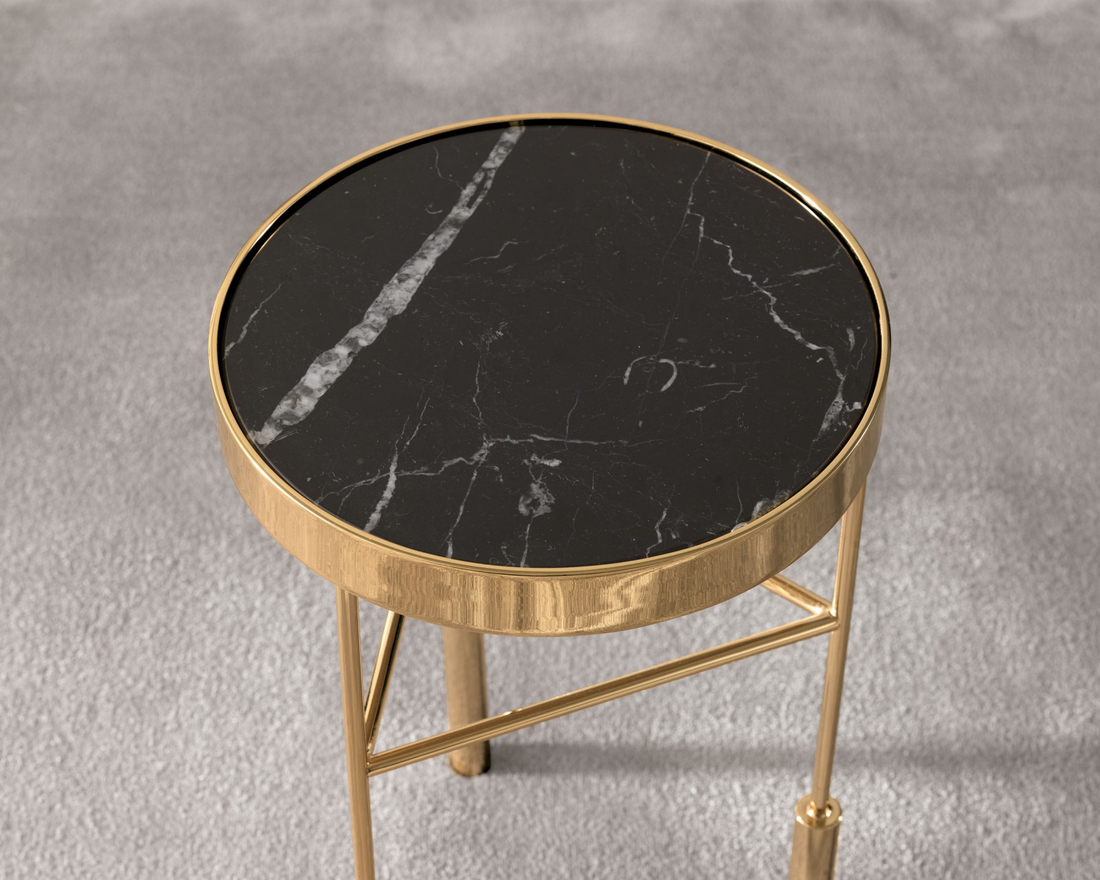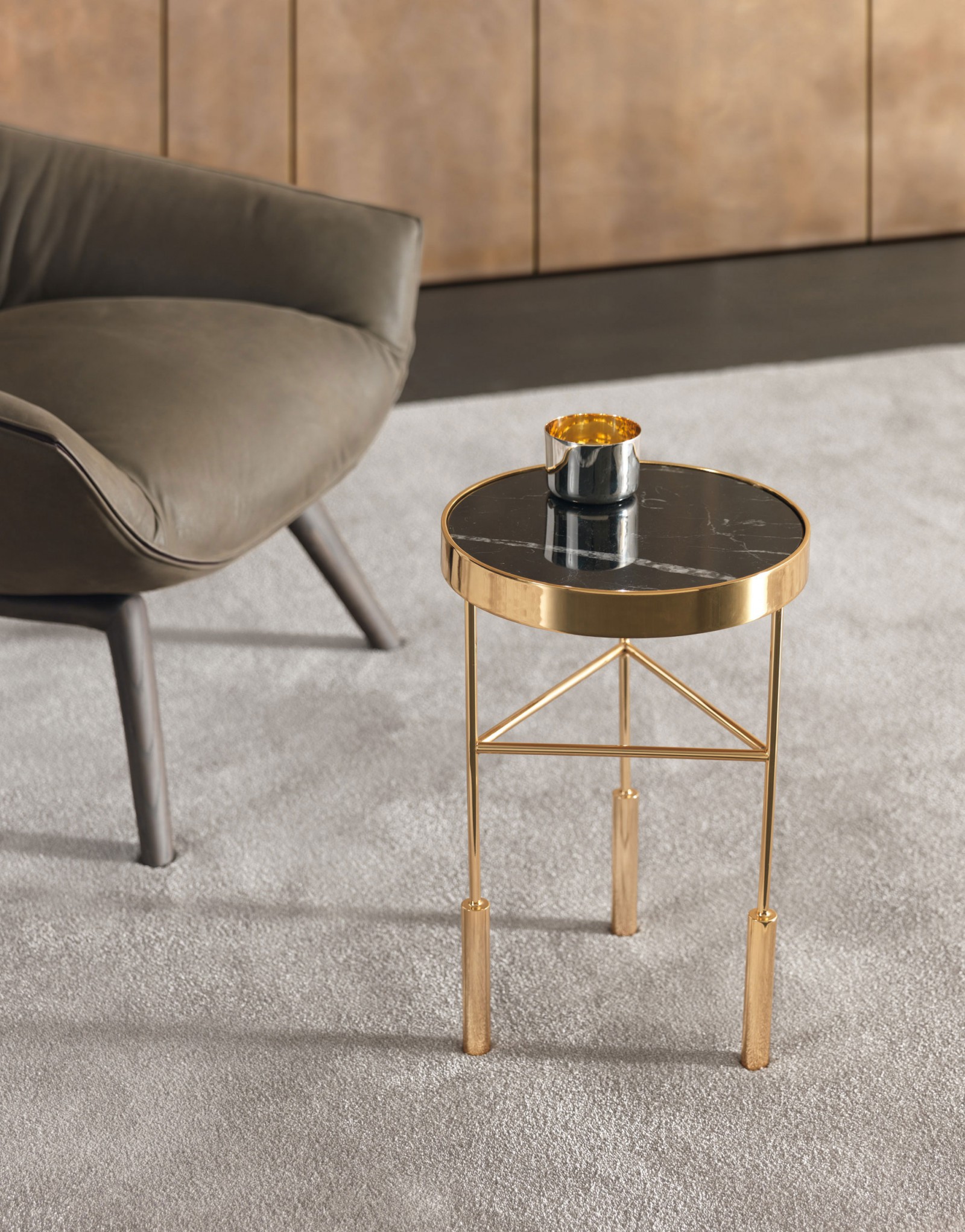 原始而精致的三腳邊桌Sirius。完美的三角形管形桌腿在金色鍍鎳表層勾勒下,顯現(xiàn)出修長(zhǎng)閃耀的輪廓,
