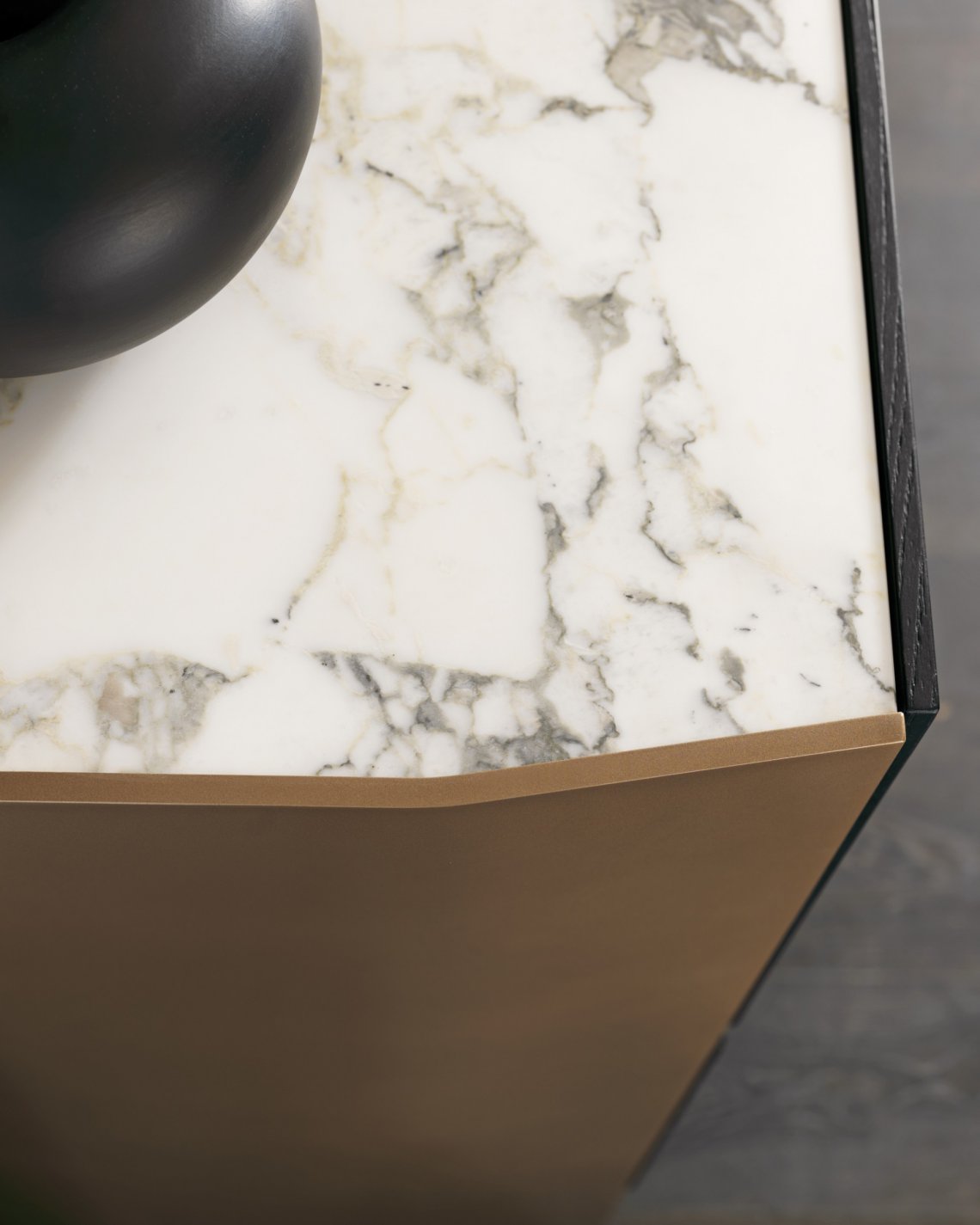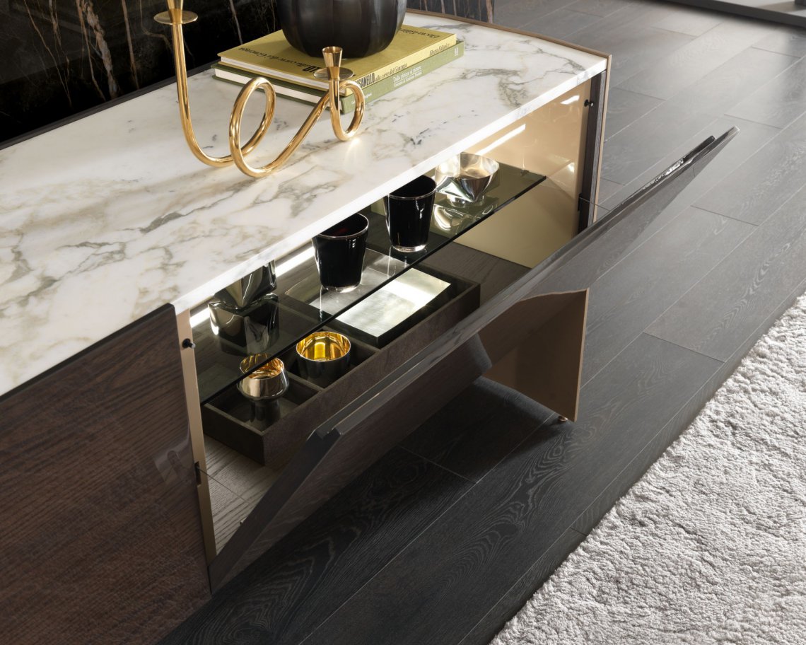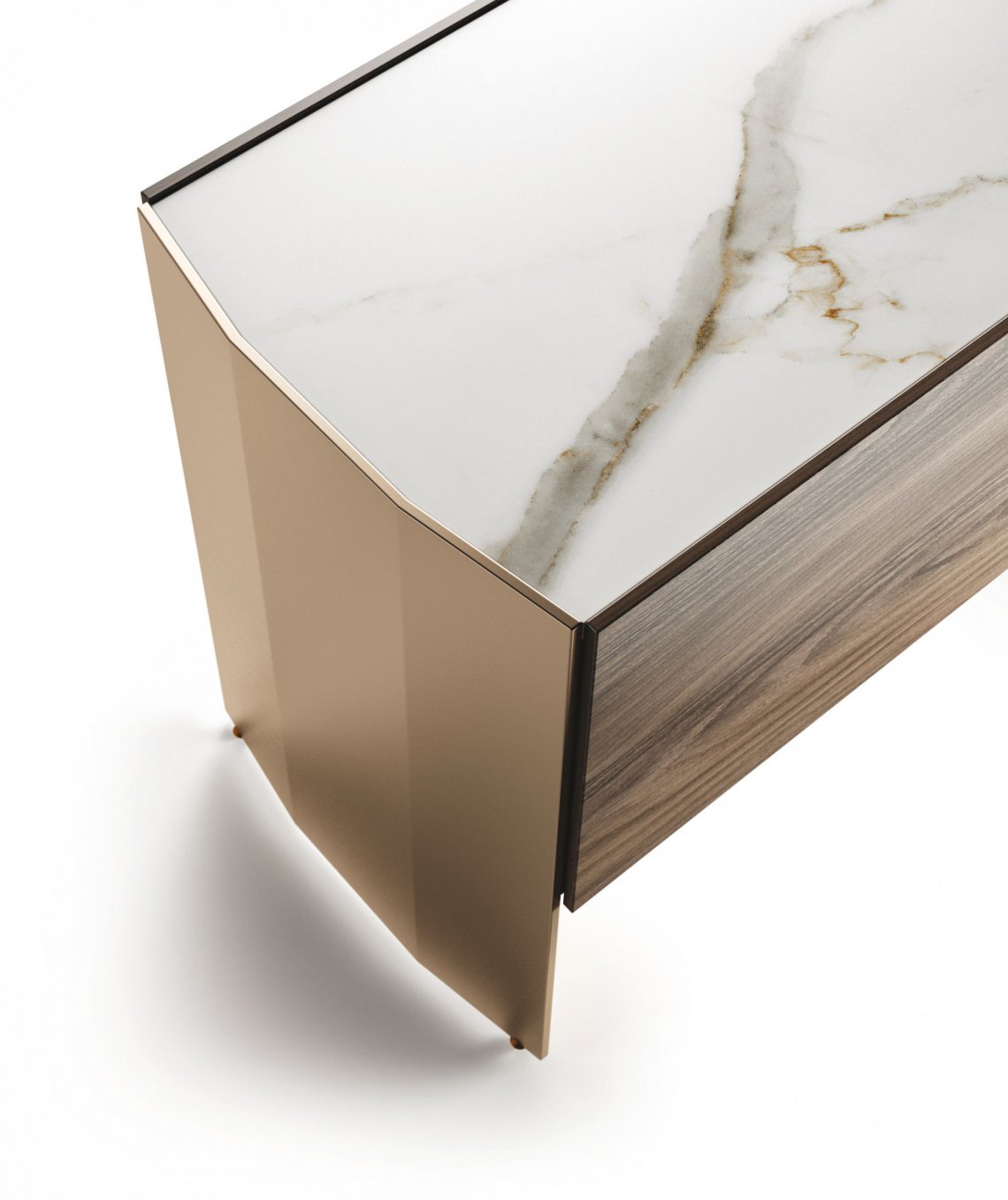 槍灰色或者青銅色的鋁合金框架側(cè)板,與胡桃木,灰榆木,白蠟?zāi)荆瑹熝鹉净蚝谙鹉荆由险滟F的實木,漆面或大理石等材質(zhì)構(gòu)成多種抽屜選擇。再配有原色或者煙熏色玻璃層架,和通常以實木或理石臺面材質(zhì)的抽屜柜完美匹配,賦予一種本真的意味。