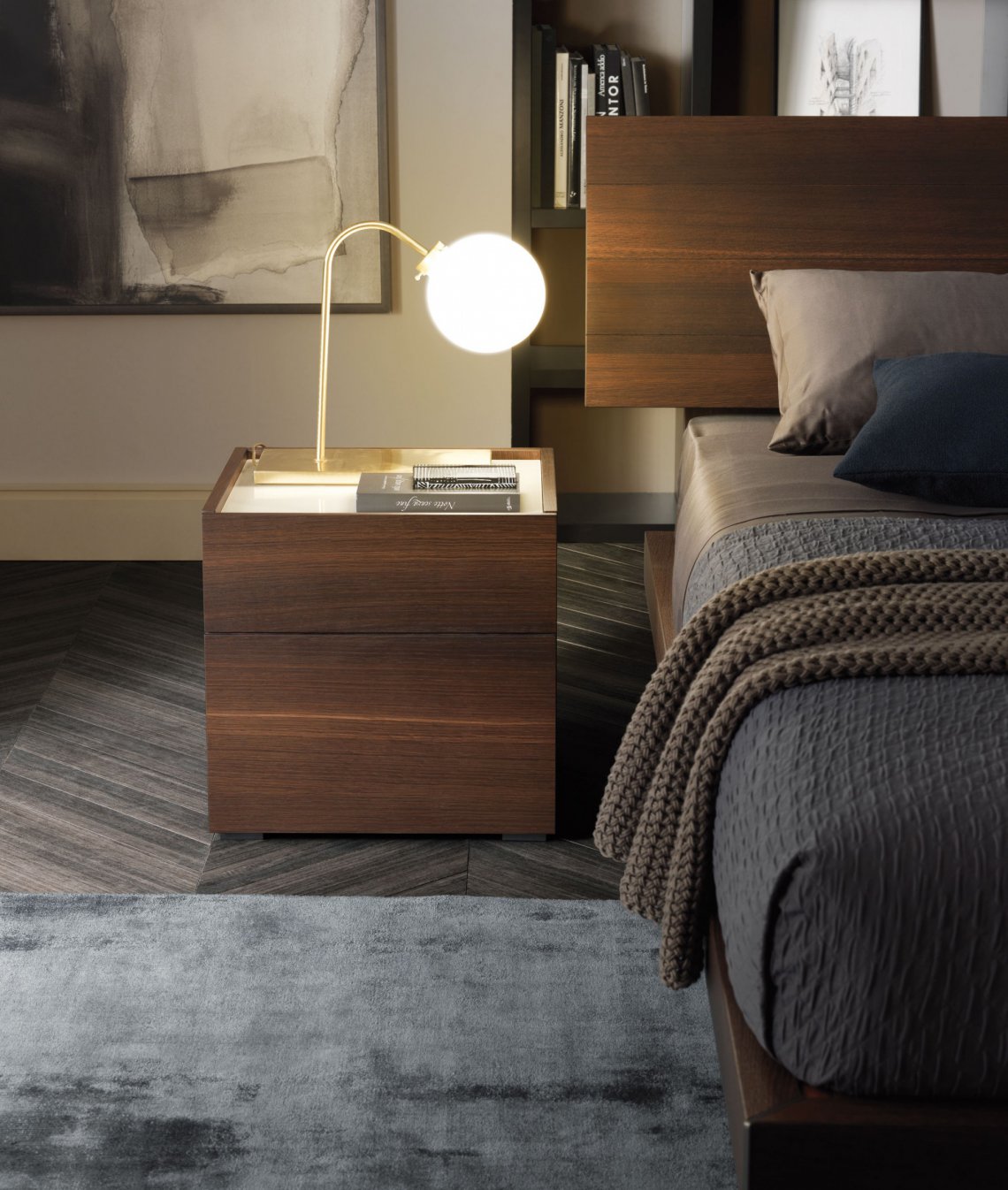 各式各樣的抽屜柜和床頭柜,巧妙與木材、漆器和玻璃結合。頂部弱化了繁瑣的結構