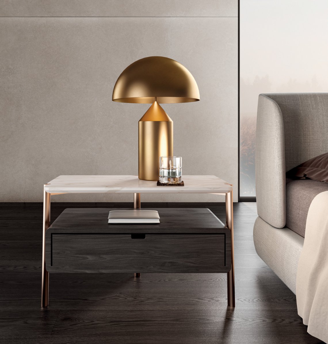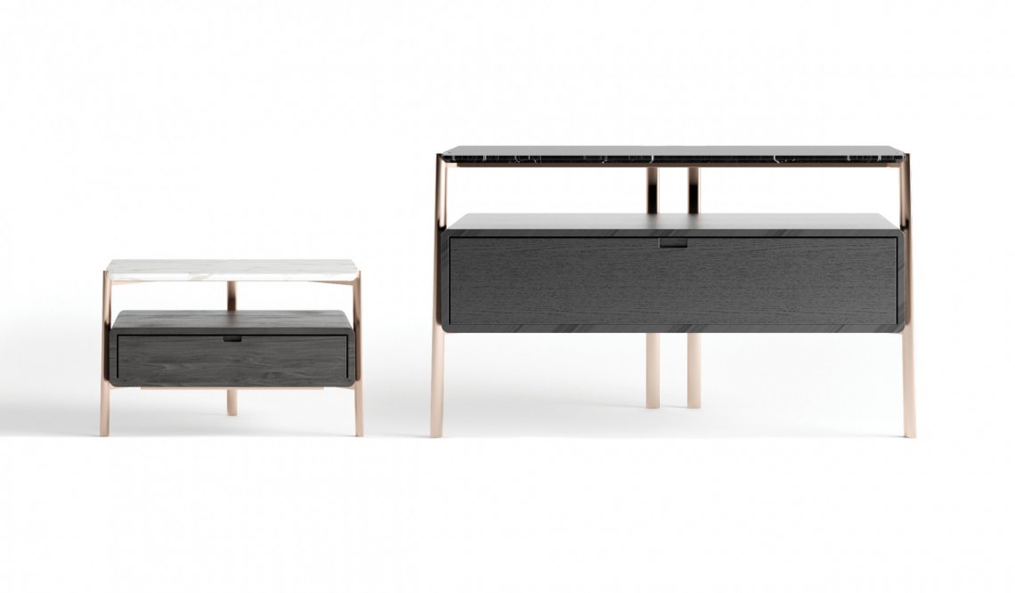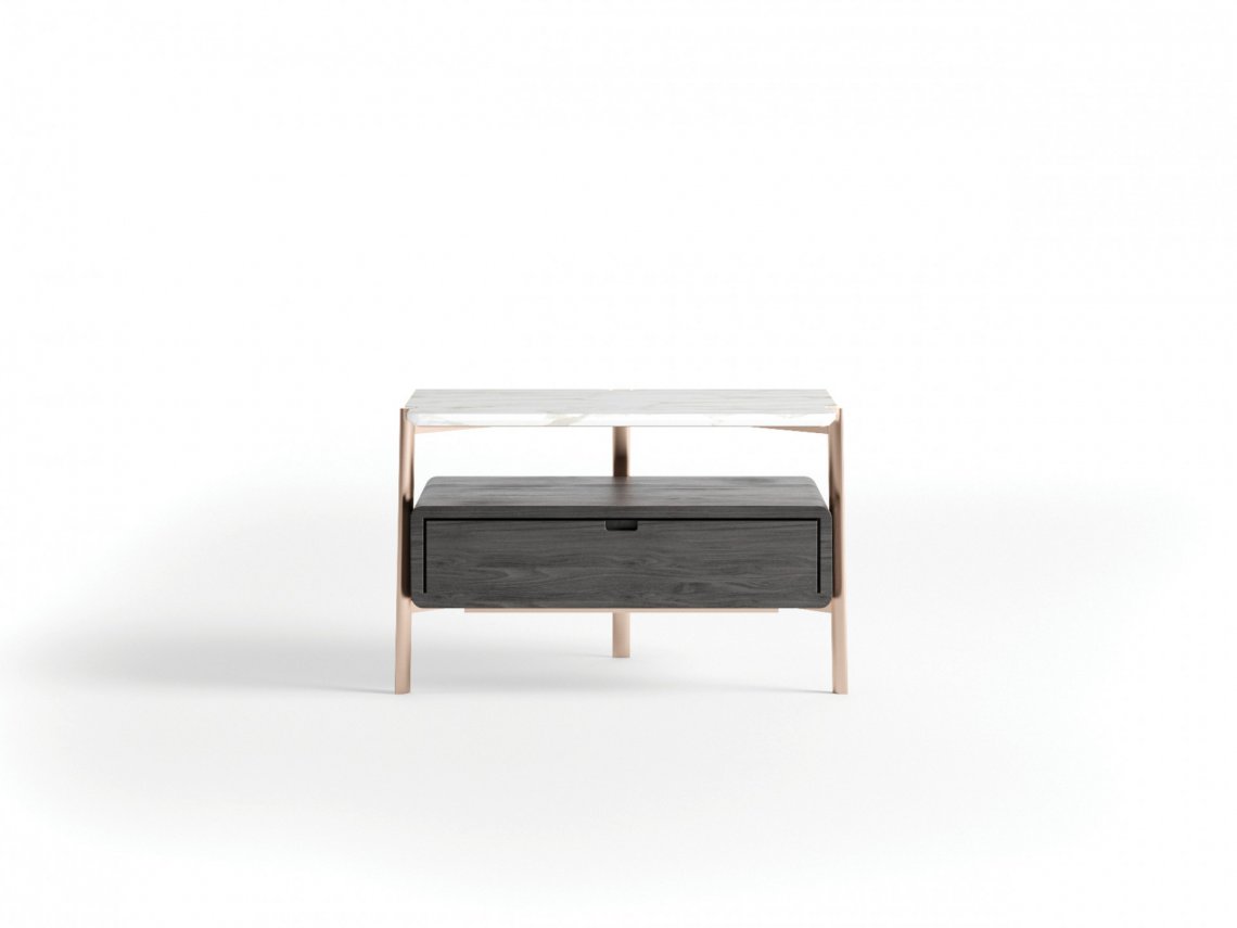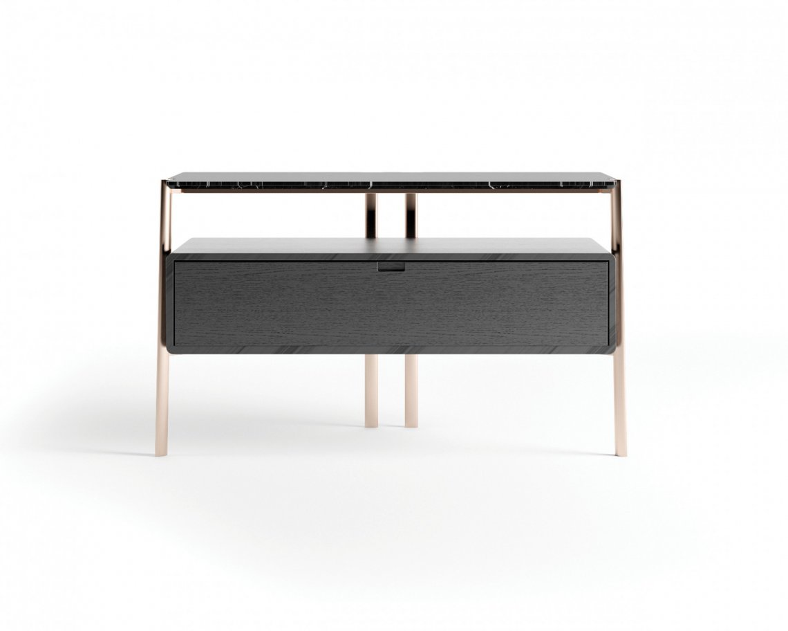 The Eros night group, consisting of a chest of drawers and bedside table, is characterized by the sophisticated dialogue between the different materials that compose it: metal, marble, wood. The bronze painted metal oval diameter structure supports a precious marble support surface through a sophisticated recess inside which it is inserted.