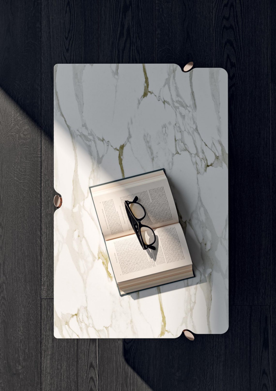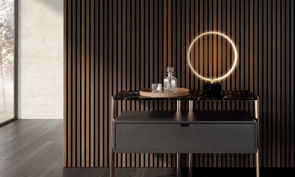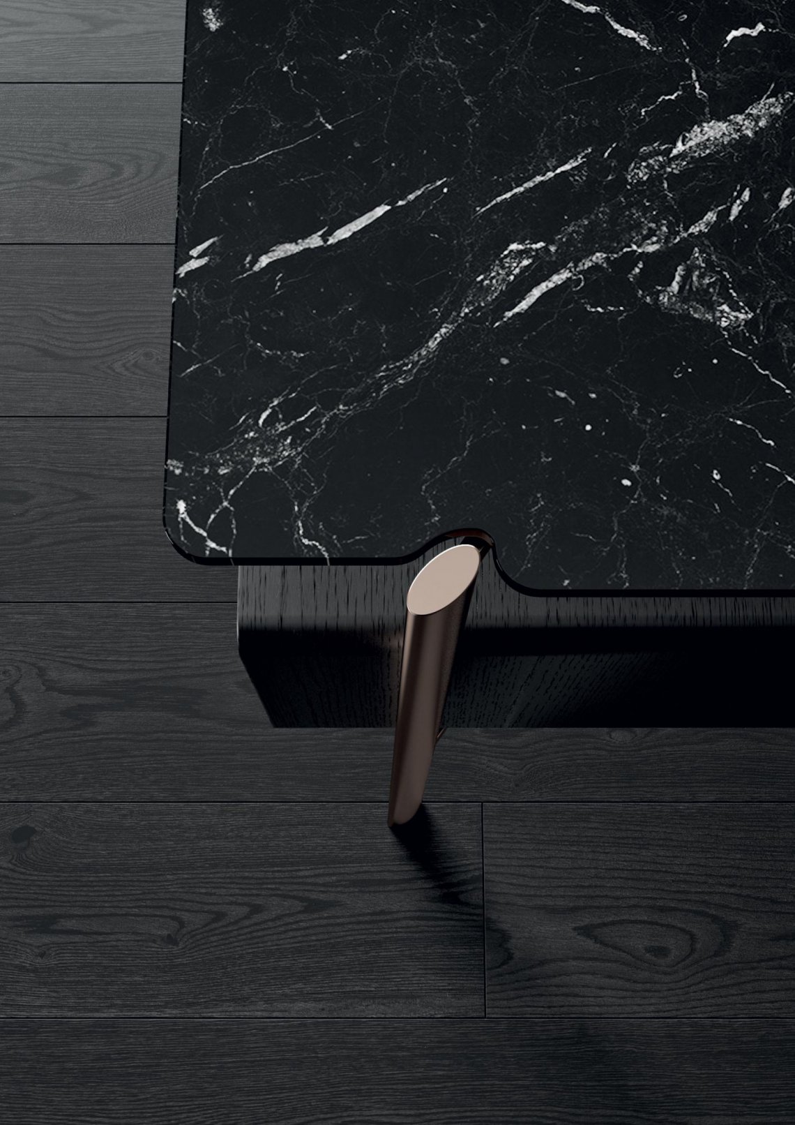 The Eros night group, consisting of a chest of drawers and bedside table, is characterized by the sophisticated dialogue between the different materials that compose it: metal, marble, wood. The bronze painted metal oval diameter structure supports a precious marble support surface through a sophisticated recess inside which it is inserted.