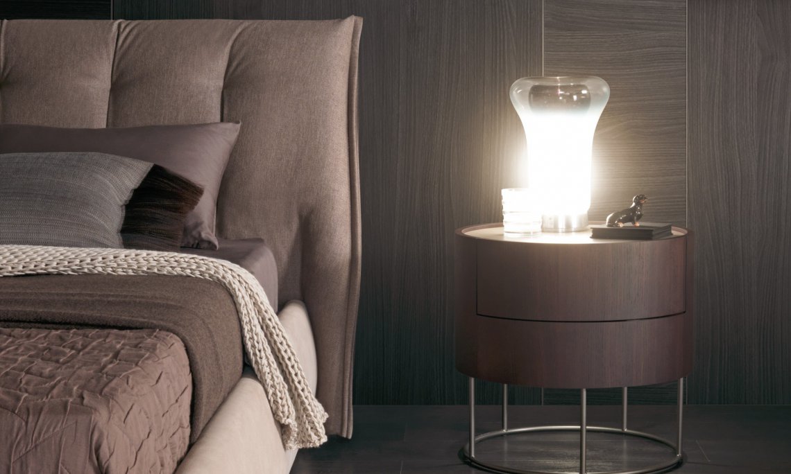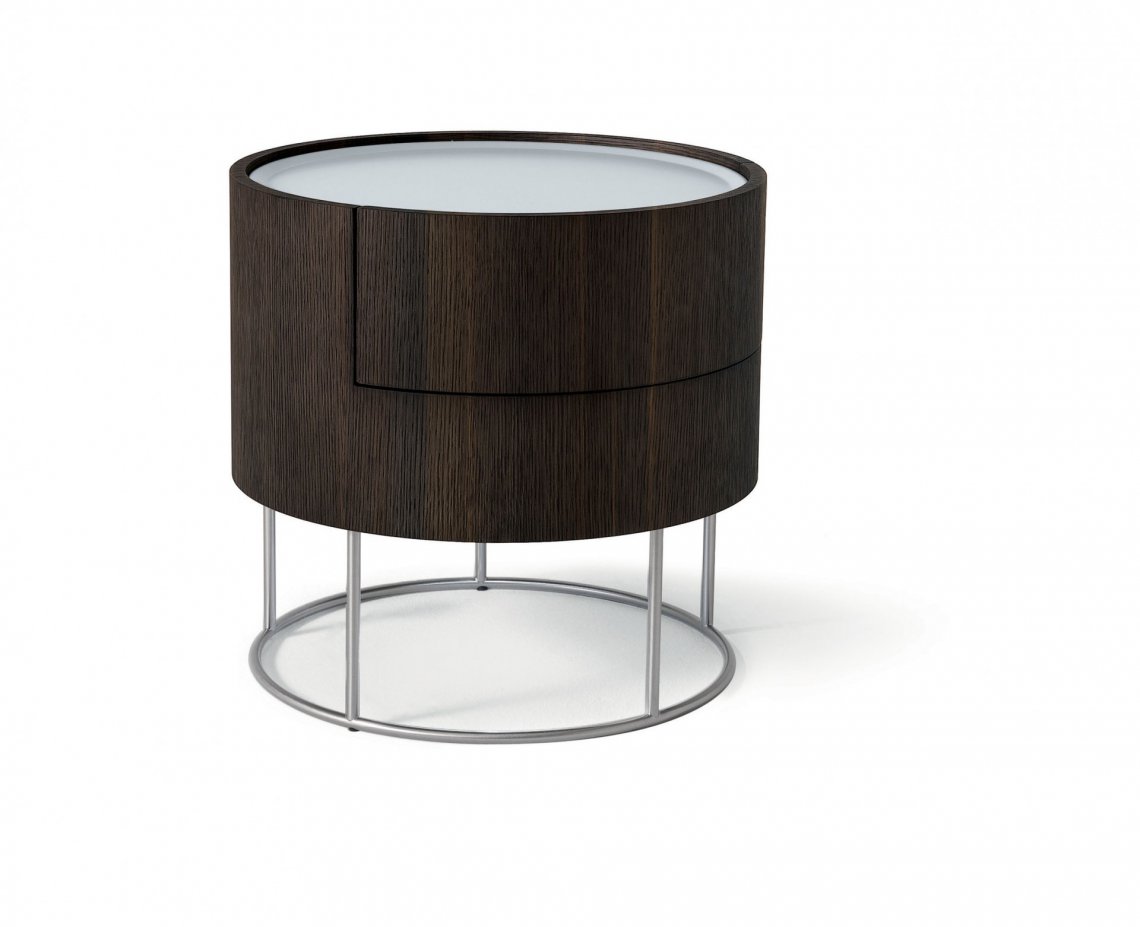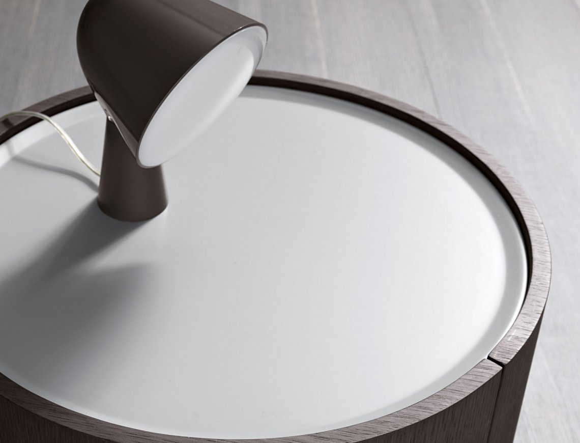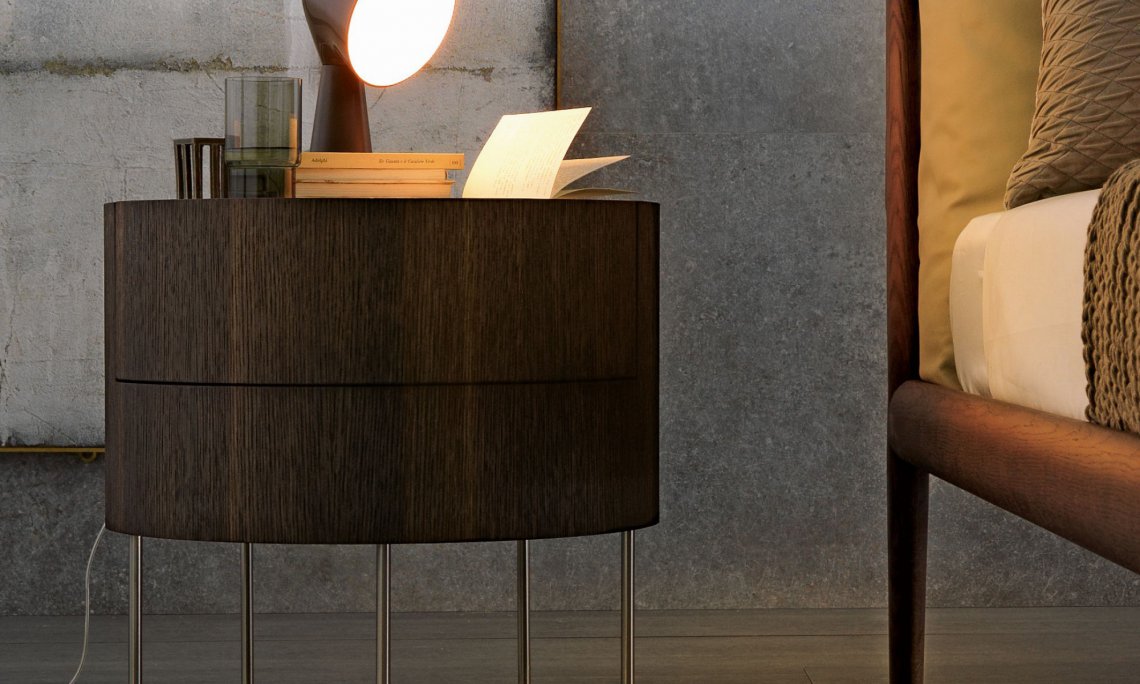 木紋貼皮圓筒狀的床邊單元柜,采用纖細的金屬撐腿支撐結(jié)構(gòu)。撐腳則可用磨砂緞光金屬色或 暗銅色處理。 備有一盞特色設計燈可以放于床頭的最上方作床頭點綴
