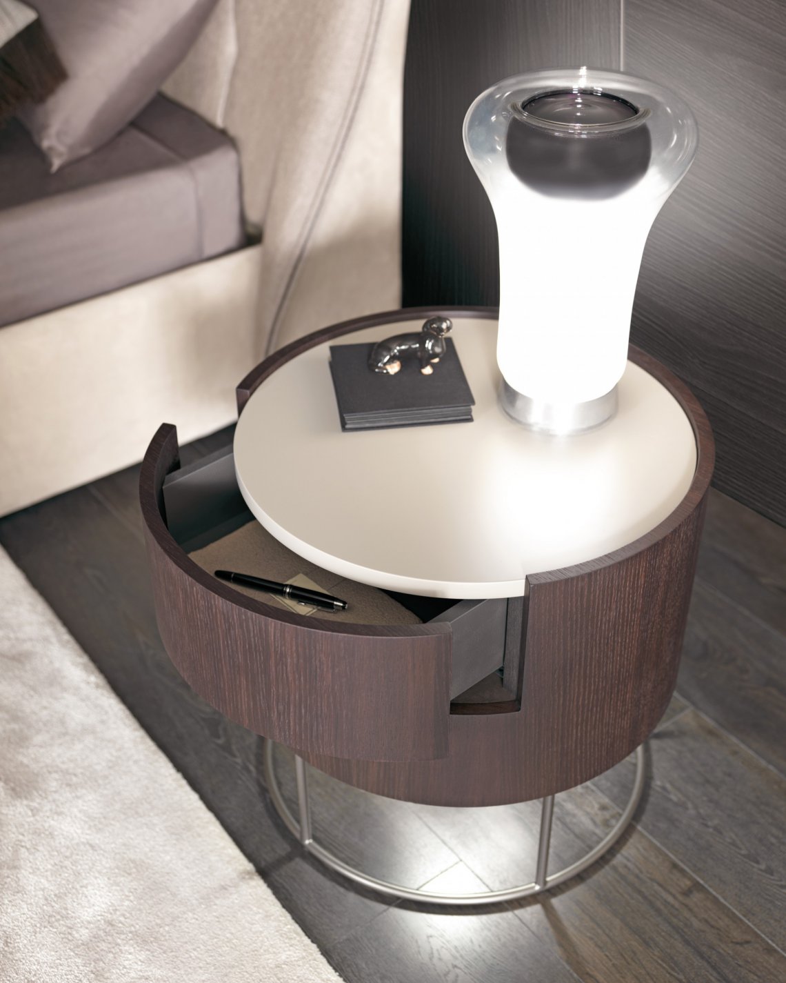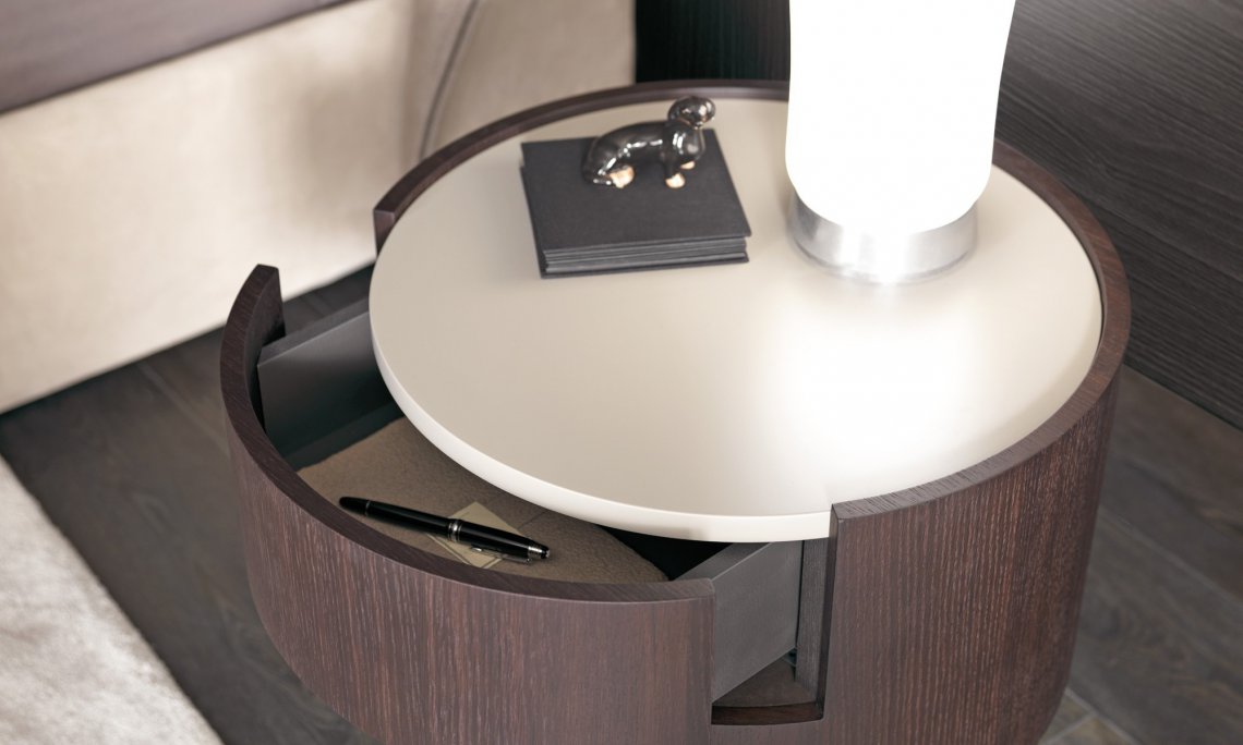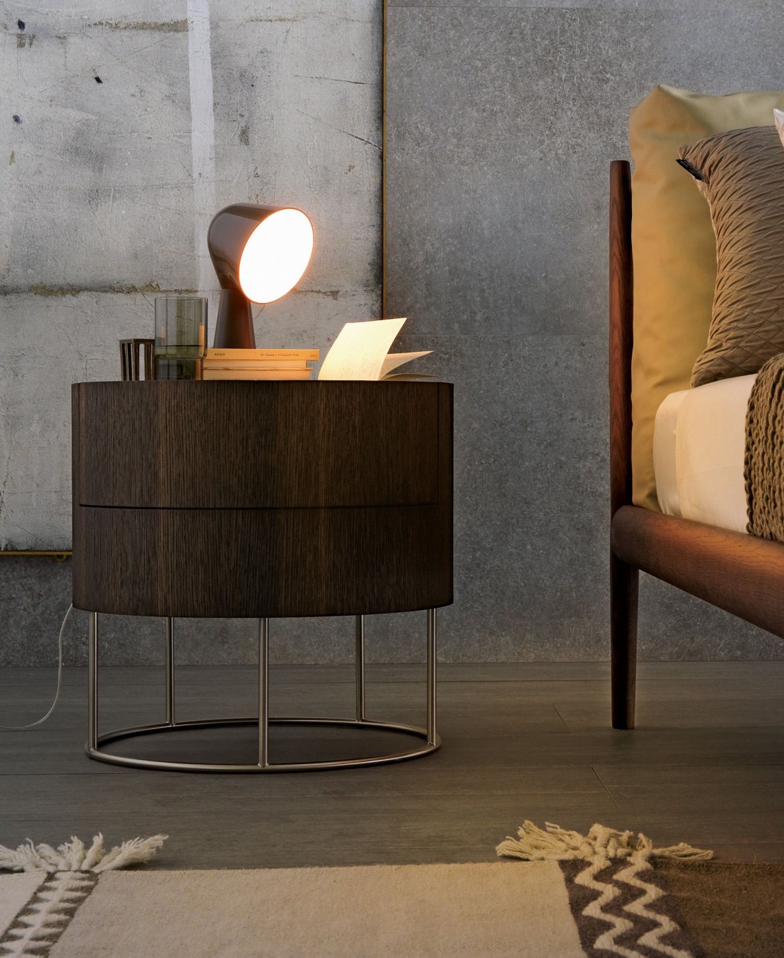 木紋貼皮圓筒狀的床邊單元柜,采用纖細的金屬撐腿支撐結(jié)構(gòu)。撐腳則可用磨砂緞光金屬色或 暗銅色處理。 備有一盞特色設計燈可以放于床頭的最上方作床頭點綴