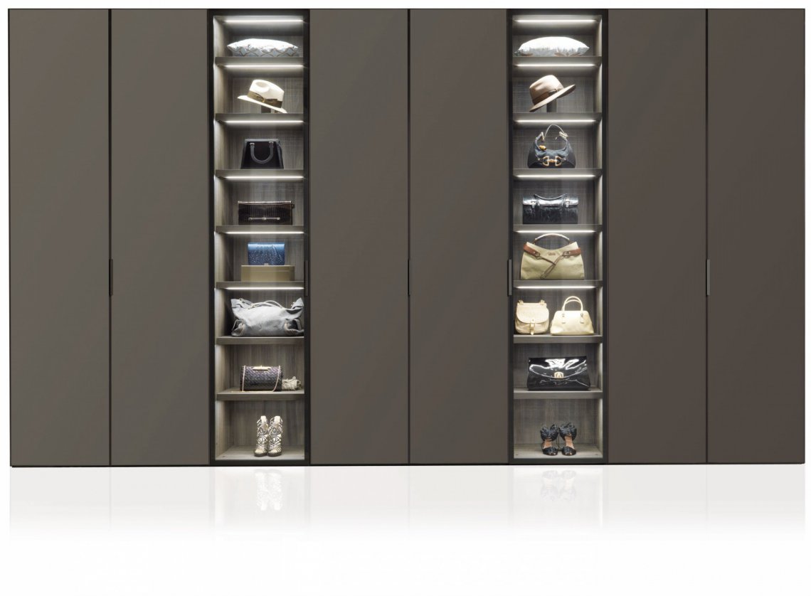 I-Box衣柜系統:Narcisse門產品系列由透明玻璃和鍛光鋁合金框架打造,內部結構和抽屜柜則是熏橡木美耐板材構成,簡約優雅的線性設計反映傳統價值和當代需求。